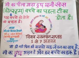 आंगनवाड़ी क्रमांक 1 में भी स्तनपान का कार्यक्रम किया गया है कार्यक्रम में उपस्थिति मीना आंगनवाड़ी कार्यकर्ता सहायिका सुगंती और यशोदा पोपली रामबाई पिंकी और आंगन वाड़ी के बालक बालिकाओं के साथ में 1 August se 7 August Tak विश्व स्तनपान दिवस मनाया गया आज विश्व स्तनपान दिवस का पहला दिन मैं किशोरी बालिका गर्भवती धात्री माताओं के साथ रैली का आयोजन किया गया और स्तनपान के प्रति जागरूक किया गया एवं महिलाओं को विश्व स्तनपान सप्ताह के गाने को मोबाइल पर बजाए बजाए और वीडियो जीना इसी का नाम है वीडियो दिखाई गई