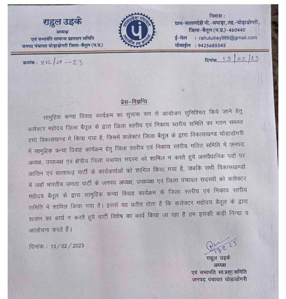 सामुहिक कन्या विवाह कार्यक्रम का सुचारू रूप से आयोजन सुनिश्चित किये जाने हेतु कलेक्टर महोदय जिला बैतूल के द्वारा जिला स्तरीय एवं निकाय स्तरीय समिति का गठन समस्त दसो विकासखण्ड में किया गया है , जिसमें कलेक्टर जिला बैतूल के द्वारा विकासखण्ड घोड़ाडोंगरी में सामुहिक कन्या विवाह कार्यक्रम हेतु जिला स्तरीय एवं निकाय स्तरीय गठित समिति में जनपद अध्यक्ष , उपाध्यक्ष एवं क्षेत्रीय जिला पंचायत सदस्य को शामिल न करते हुये असंवैधानिक पदो पर आसिन एवं सत्तारूढ़ पार्टी के कार्यकर्ताओं को शामिल किया गया है , जबकि सभी विकासखण्डों में जहाँ भारतीय जनता पार्टी के जनपद अध्यक्ष , उपाध्यक्ष एवं जिला पंचायत सदस्यों को कलेक्टर महोदय बैतूल के द्वारा सामुहिक कन्या विवाह कार्यक्रम के जिला स्तरीय एवं निकाय स्तरीय समिति में शामिल किया गया है । इससे यह प्रतीत होता है कि कलेक्टर महोदय बैतूल के द्वारा शासन का कार्य न करते हुये पार्टी विशेष का कार्य किया जा रहा है हम इसकी कड़ी निन्दा व आलोचना करते हैं ।