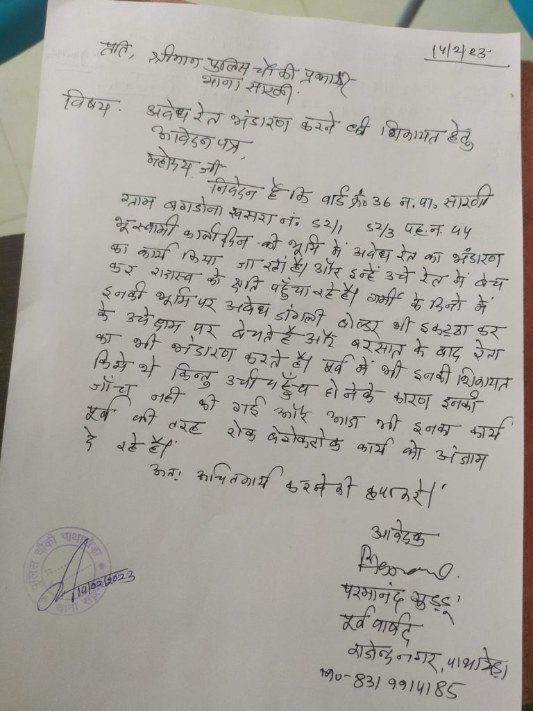 सारनी- न. पा. वार्ड क्र. ३६ वैसे भी सुर्ख़ियों में रहता है इसी तारतम्य में एक और अवैध कार्य रेत भंडारण भी हो रहाँ है ‘ ग्राम बागडोना में बिना रॉयल्टी के अवैध रेत भडारण का कार्य किया जा रहाँ है और इन्हे उचे भाव में बेचकर राजस्व विभाग को चुना लगाने का कार्य किया जा रहाँ है । गर्मी के सीजन में जंगली बोल्डर को एकत्र करते है और बरसात समाप्त होने पर रेता रात के अंधेरे मे और सुबह सुबह ग्राहक को बेच देते है जिसकी शिकायत स्थानिय संम्बधित विभाग को की गई है किंतु कोई कार्यवाही नही करता इस कार्य में सलग्न व्यक्ति मी राजनीतिक पहुँच रखते है और प्रशासन की आँखो में धूल झोककर लाखो रुपयो का चुना लगाकर राजस्व को क्षति पहुंचा रहे है ।