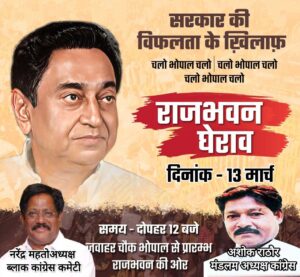 घोड़ाडोंगरी ब्लॉक कांग्रेस कमेटी अध्यक्ष नरेंद्र महतो ने बताया कि अखिल भारतीय कांग्रेस कमेटी द्वारा लिए गए निर्णय अनुसार प्रदेश कांग्रेस अध्यक्ष मान . श्री कमलनाथ जी ( पूर्व मुख्यमंत्री ) के निर्देशानुसार दिनांक 13 मार्च 2023 को भोपाल में ” राजभवन का घेराव – विशाल मार्च ” का आयोजन किया गया है । राजभवन घेराव कार्यक्रम में अ.भा. कांग्रेस कमेटी के म.प्र . प्रभारी मान . श्री जयप्रकाश अग्रवाल जी , प्रदेश कांग्रेस अध्यक्ष मान श्री कमलनाथ जी एवं प्रदेश के सभी वरिष्ठ नेतागणों की उपस्थिति में दिनांक 13 मार्च 2023 को दोपहर 12 बजे राजधानी भोपाल में जवाहर चौक पर सभी कांग्रेस जन एकत्रित होकर राजभवन घेराव के लिए कूच करेंगे ।