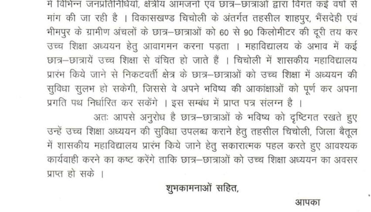 हर्ष भुसारी की मांग पर कमलनाथ ने उच्च शिक्षा विभाग के उपर मुख्य सचिव के.सी. गुप्ता को आवेदन लिखा है , उसमे कमलनाथ ने स्पष्ट रूप से चिचोली क्षेत्र में कॉलेज खोलने की बात रखी है।