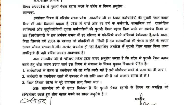 ग्वालियर/ भोपाल 11 मार्च, अनुसूचित जाति जनजाति संगठनों के अखिल भारतीय परिसंघ मध्य प्रदेश की इकाई द्वारा प्रदेश में पुरानी पेंशन बहाल किए जाने हेतु प्रदेश के मुख्यमंत्री को पत्र भेजकर जनहित में शीघ्र पुरानी पेंशन बहाली का अनुरोध किया है प्रेस को जारी विज्ञप्ति मैं परिसंघ के प्रदेश महासचिव नरेंद्र चौधरी द्वारा मुख्यमंत्री को सुझाव सहित अनुरोध किया गया है