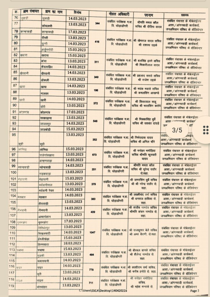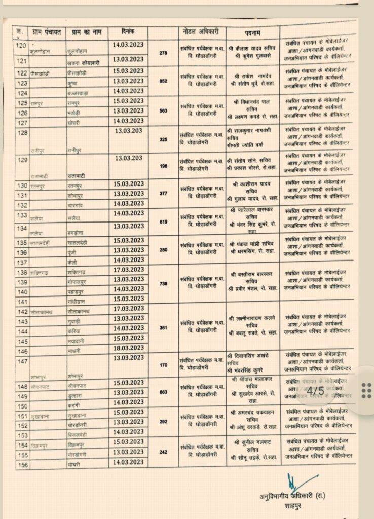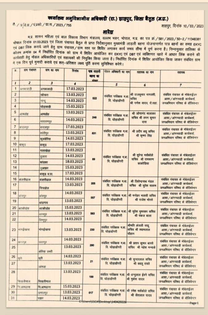 मुख्यमंत्री लाडली बहना योजना अंतर्गत समग्र ईकेवाईसी एवं डीबीटी लिंक कराने हेतु घोड़ाडोंगरी क्षेत्र के ग्राम पंचायतों में शिविर आयोजित किए जा रहे हैं जिसके लिए एसडीएम शाहपुर द्वारा आदेश जारी कर निर्धारित दिनांक में शिविर आयोजित करने के लिए संबंधित कर्मचारियों अधिकारियों सहायकों की नियुक्ति की गई है ग्राम पंचायतों को निर्देशित किया गया है कि 1 दिन पूर्व मुनादी कराएं और ग्रामीणों को सूचना दें