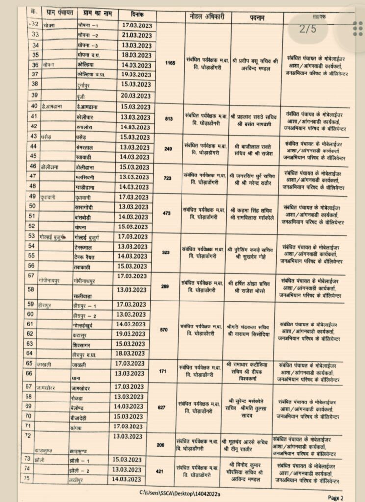 लोगों को ग्रामीण स्तर पर उनके अपने गांव में यह सुविधा उपलब्ध कराई गई है वही सारणी नगर पालिका के सीएमओ ने बताया कि प्रत्येक आंगनवाड़ी केंद्र पर सारणी नगर पालिका क्षेत्र में यह सुविधा महिलाओं को देने के लिए शिविर लगाए गए हैं जाने घोड़ाडोंगरी विकासखंड के किस ग्राम पंचायत में किस तारीख को शिविर आयोजित किए गए हैं।