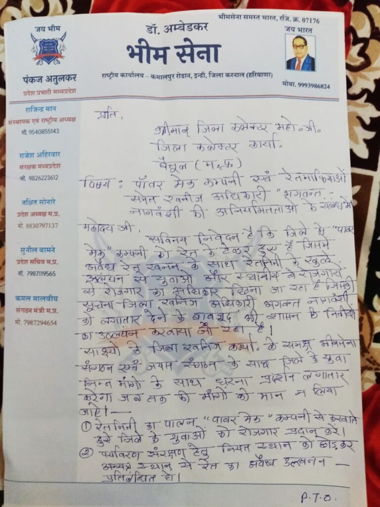 Betul_ भीम सेना ने रेत कंपनी पर रेत नीति के उल्लंघन का आरोप लगाते हुए आंदोलन की चेतावनी दी है जिसमें भीम सेना ने घोषणा की है कि कल गुरुवार 16 मार्च को खनिज कार्यालय के सामने प्रदर्शन किया जाएगा भीम सेना ने आरोप लगाया है कि नदियों में मशीनों से रेत का उत्खनन करके पर्यावरण और जलीय जीवों को नुकसान पहुंचाया जा रहा है युवाओं और मजदूरों को रोजगार से वंचित किया जा रहा है ।
