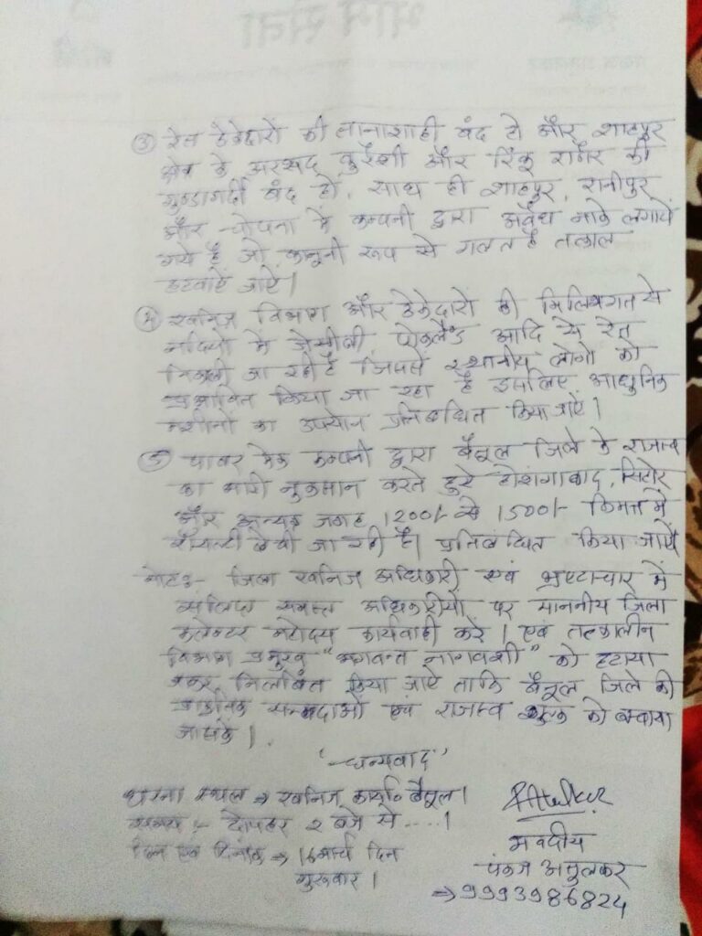 अपनी निर्धारित रेत खदान पर कार्य करने की बजाय पूरे क्षेत्र में जबरन वाहनों को रोककर जांच करके ठेकेदार के कर्मचारी दबंगई करते हुए अधिकारी की तरह वाहनों की जांच कर रहे हैं जिम्मेदार अधिकारियों द्वारा कोई कार्रवाई नहीं करने से ऐसा संदेश जनता में जा रहा है कि ठेकेदार के कर्मचारियों को संरक्षण मिला हुआ है। भीम सेना द्वारा जयस संगठन के साथ मिलकर गुरुवार 16 मार्च को खनिज कार्यालय के सामने विशाल धरना प्रदर्शन करने का संदेश दिया गया है।