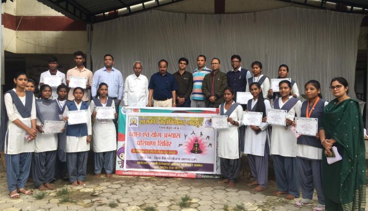 शासकीय महाविद्यालय शाहपुर में विश्व बैंक गुणवत्ता उन्नयन परियोजना के अंतर्गत स्वामी विवेकानंद करियर मार्गदर्शन प्रकोष्ठ एवं राष्ट्रीय सेवा योजना छात्रा इकाई के संयुक्त तत्वाधान में क्रीड़ा विभाग द्वारा 10 दिवसीय योग शिविर का आयोजन दिनांक 05/03/2023 से दिनांक 15/03/2023 के मध्य किया गया योग शिविर में 30 विद्यार्थी एवं तीन सहायक प्राध्यापकों , डॉक्टर ओम झा , प्रोफेसर ए आर इवने सहायक प्राध्यापक अर्थशास्त्र एवं डॉ सुभाष वर्मा सहायक प्राध्यापक हिंदी ने सहभागिता की l योग प्रशिक्षक के रूप में श्री रोशनलाल मोखेड़े बैतूल द्वारा 10 दिवसीय योग शिविर में