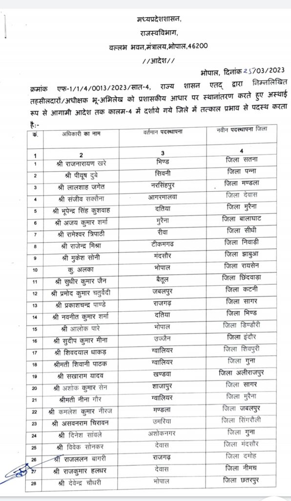 मध्यप्रदेशशासन , राजस्व विभाग , वल्लभ भवन , मंत्रालय , भोपाल , 46200 // आदेश // भोपाल , दिनांक 25703/2023 क्रमांक एफ -1 / 1 / 4 / 0013 / 2023 / सात -4 , राज्य शासन एतद् द्वारा निम्नलिखित हुए अस्थाई तहसीलदारों / अधीक्षक भू – अभिलेख को प्रशासकीय आधार पर स्थानांतरण करते रूप से आगामी आदेश तक कालम -4 में दर्शाये गये जिले में तत्काल प्रभाव से पदस्थ करता है।