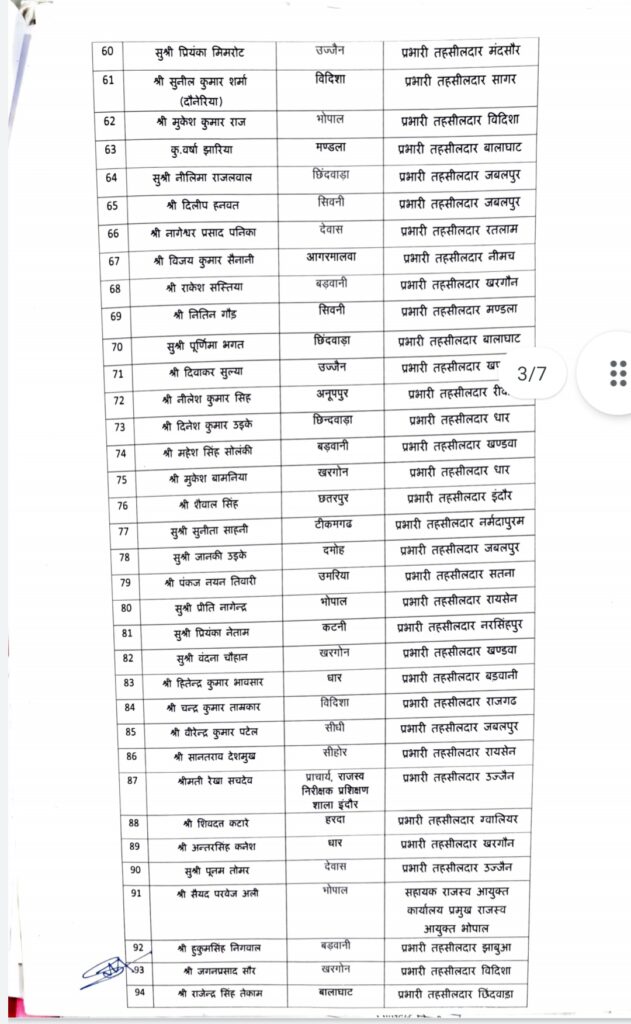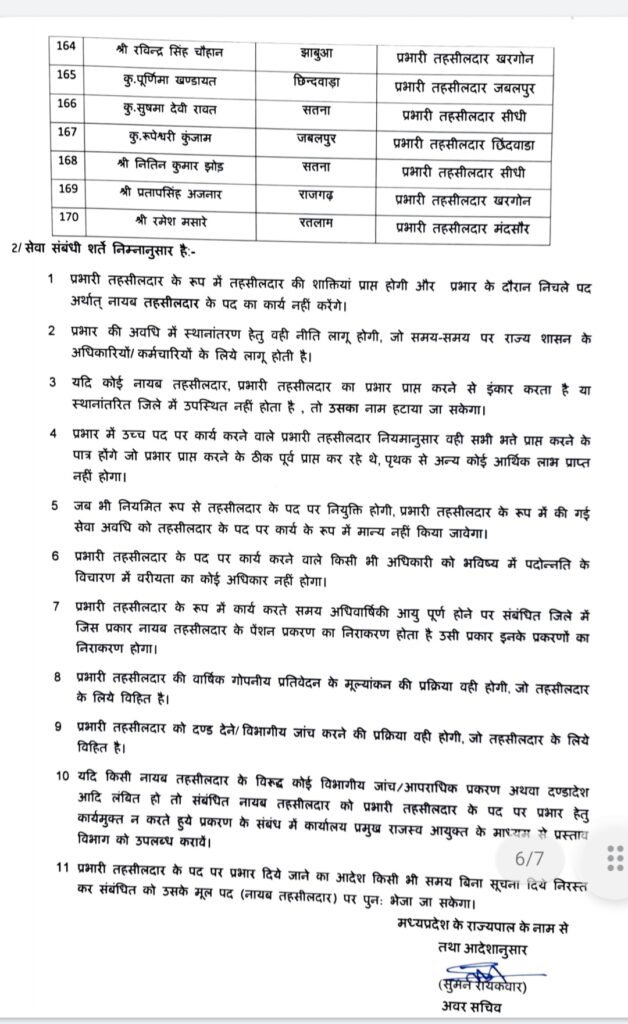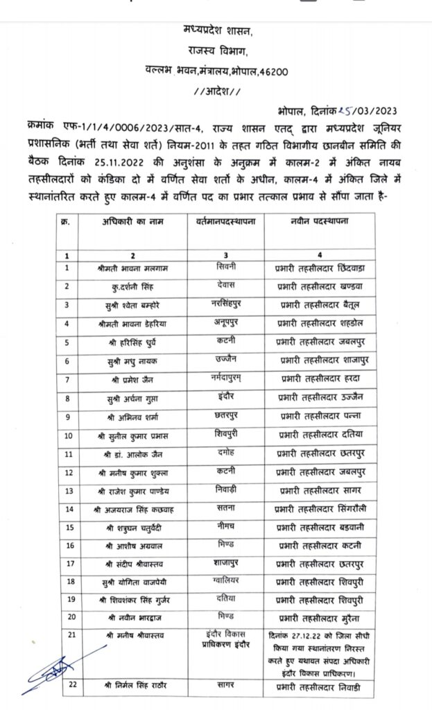 मध्यप्रदेश शासन , राजस्व विभाग , वल्लभ भवन , मंत्रालय , भोपाल , 46200 // आदेश // भोपाल , दिनांक 25/03/2023 क्रमांक एफ -1 / 1 / 4 / 0006 / 2023 / सात -4 , राज्य शासन एतद् द्वारा मध्यप्रदेश जूनियर प्रशासनिक ( भर्ती तथा सेवा शर्ते ) नियम 2011 के तहत गठित विभागीय छानबीन समिति की बैठक दिनांक 25.11.2022 की अनुशंसा के अनुक्रम में कालम -2 में अंकित नायब तहसीलदारों को कंडिका दो में वर्णित सेवा शर्तो के अधीन , कालम -4 में अंकित जिले में स्थानांतरित करते हुए कालम -4 में वर्णित पद का प्रभार तत्काल प्रभाव से सौंपा जाता है