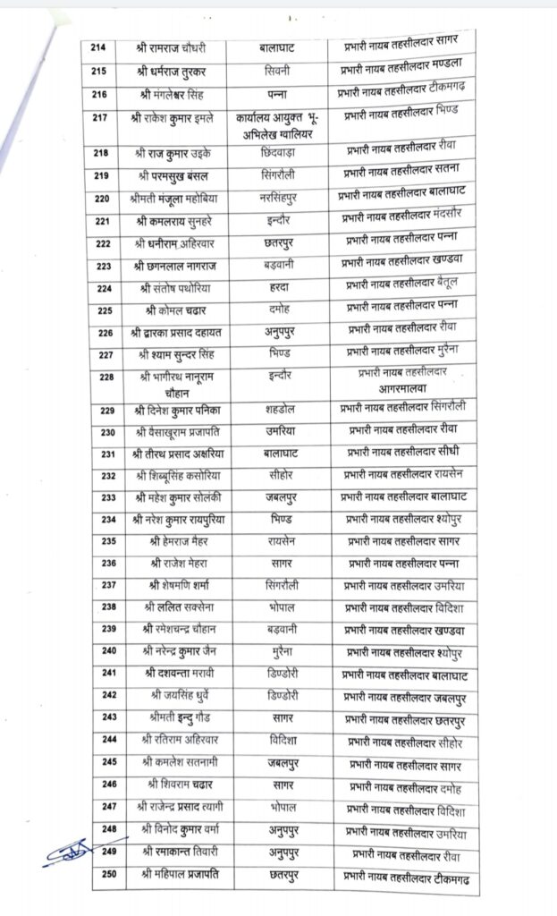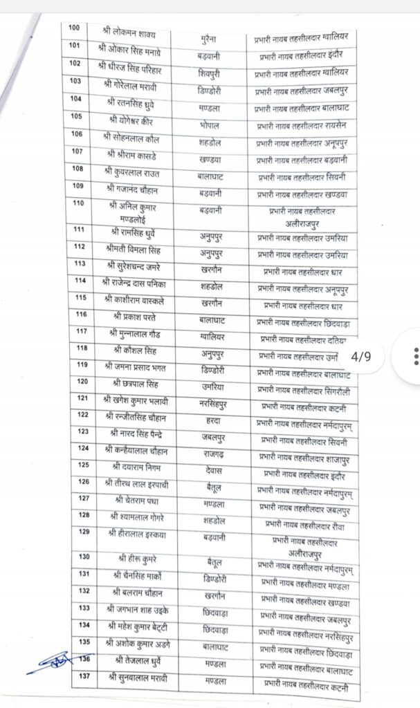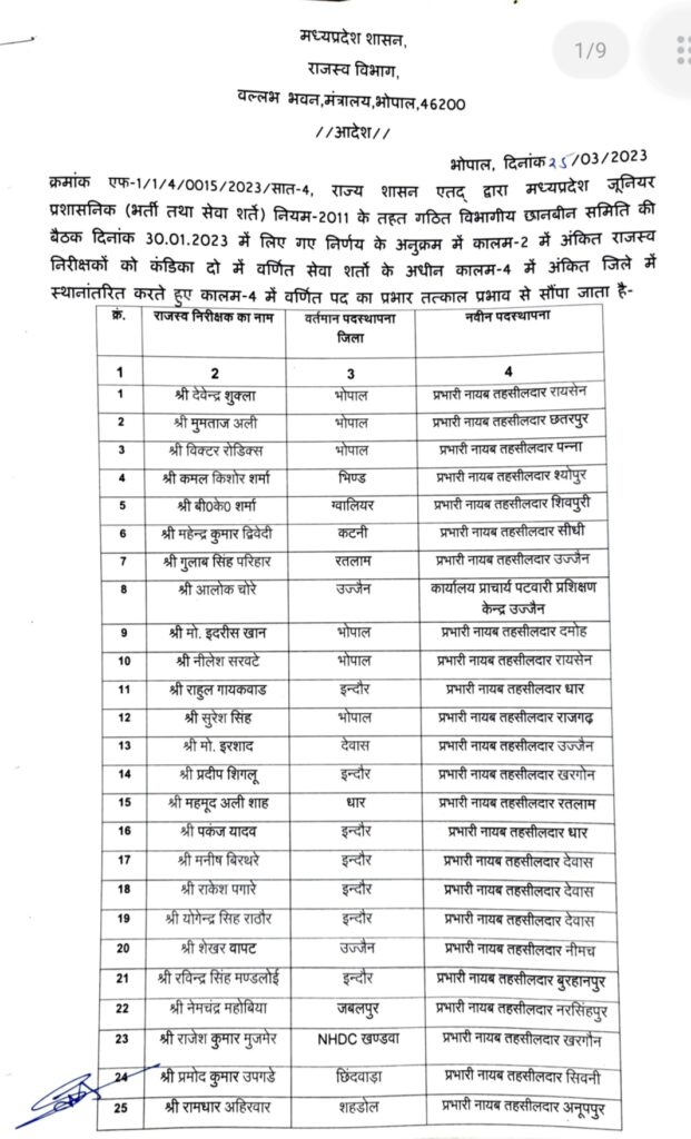 मध्यप्रदेश शासन , राजस्व विभाग , वल्लभ भवन , मंत्रालय , भोपाल , 46200 // आदेश // 1/9 भोपाल , दिनांक २ ९ / 03 / 2023 क्रमांक एफ -1 / 1 / 4 / 0015 / 2023 / सात -4 , राज्य शासन एतद् द्वारा मध्यप्रदेश जूनियर प्रशासनिक ( भर्ती तथा सेवा शर्ते ) नियम -2011 के तहत गठित विभागीय छानबीन समिति की बैठक दिनांक 30.01.2023 में लिए गए निर्णय के अनुक्रम में कालम -2 में अंकित राजस्व निरीक्षकों को कंडिका दो में वर्णित सेवा शर्तों के अधीन कालम -4 में अंकित जिले में स्थानांतरित करते हुए कालम -4 में वर्णित पद का प्रभार तत्काल प्रभाव से सौंपा जाता है