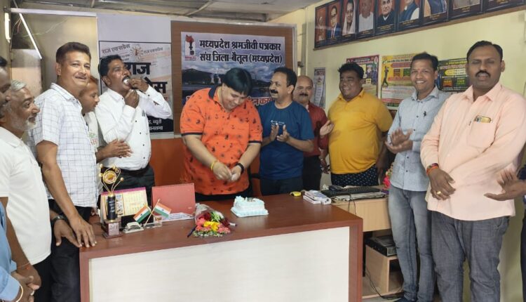 BETUL सारनी। मध्यप्रदेश श्रमजीवी पत्रकार संघ के प्रांताध्यक्ष श्री शलभ भदोरिया जी का जन्मदिवस आज मध्यप्रदेश श्रमजीवी पत्रकार संघ की बैतूल इकाई के द्वारा मनाया गया। इस अवसर पर जिला अध्यक्ष साथी रंजीत सिह के द्वारा केक काटा गया एवम श्री भदौरिया जी की लंबीआयु एवम स्वस्थ्य जीवन की कामना की गई।