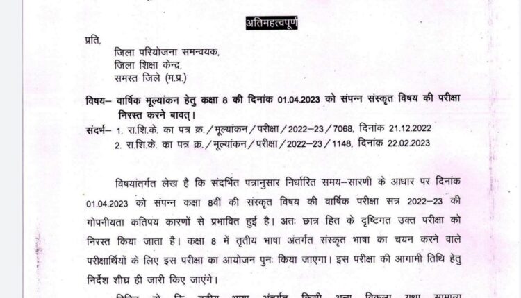 MADHYA PRADESH आठवीं का संस्कृत का पेपर किया निरस्त राज्य शिक्षा केंद्र का आदेश कल ही दिया था बच्चों ने पेपर : देखे आदेश