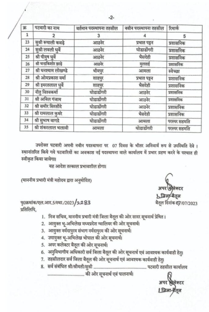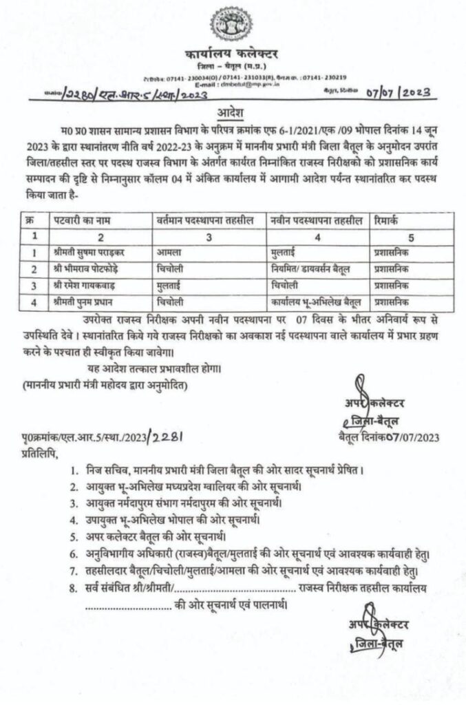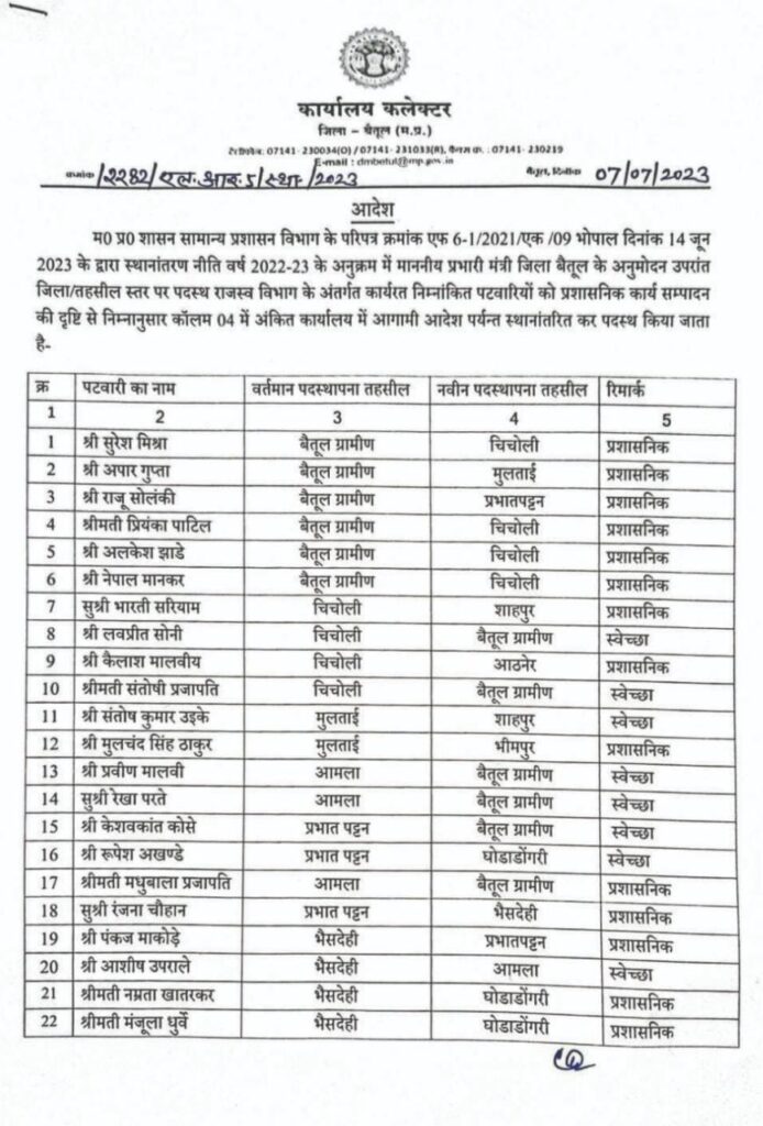 Transfer राजस्व विभाग में पटवारियों और राजस्व निरीक्षकों के हुए तबादले By Aajkakhulasha Last updated Jul 8, 2023 🔊 Listen This News इन दिनों हो रहा है तबादले की सूची मैं कलेक्टर बैतूल द्वारा राजस्व विभाग के पटवारियों और राजस्व निरीक्षकों की तबादला सूची जारी की गई है जिसमें जिले के कई कर्मचारियों के तबादले हुए हैं तबादले