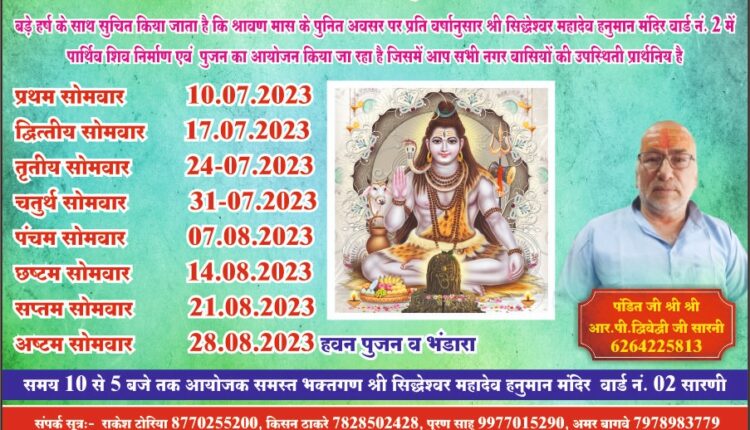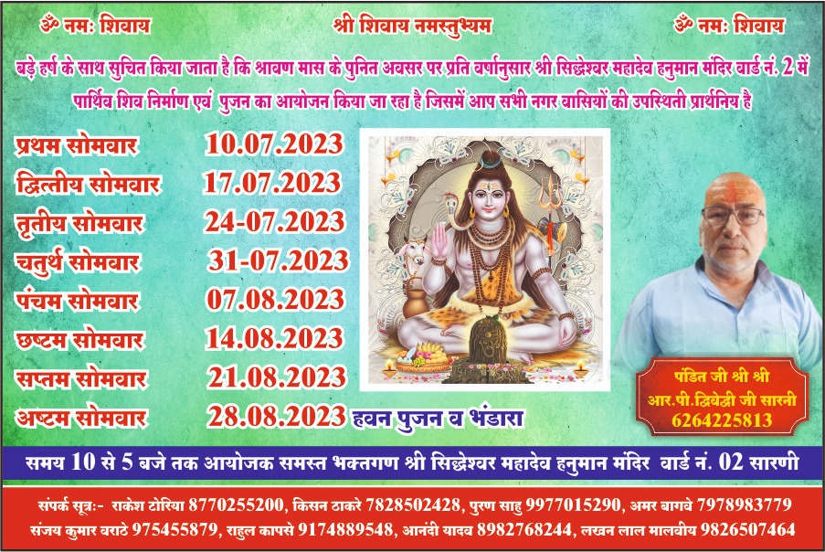 *सारनी नगर के वार्ड क्रमांक 2 मैं स्थित श्री सिद्धेश्वर महादेव हनुमान मंदिर में प्रतिवर्ष अनुसार इस वर्ष भी श्रावण मास के प्रत्येक सोमवार को पार्थिव शिवलिंग निर्माण एवं पूजन का आयोजन किया जा रहा है मंदिर से जुड़े राकेश टोरिया किशन ठाकरे आनंदी यादव लखनलाल मालवीय पूरण साहू अमरलाल बागवे संजय कुमार वराठे ने बताया की सारनी के पंडित आर पी द्विवेदी जी के द्वारा श्रावण मास के प्रति सोमवार को सुबह 10 से