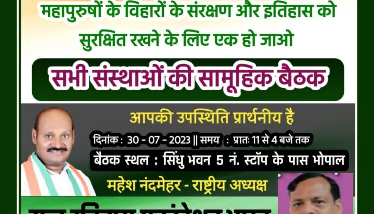 भोपाल। भोपाल में स्थित सौ बौद्ध विहार एवं सभी अनुसूचित जाति और जनजाति वर्गों के धार्मिक स्थलों व आस्था के केंद्र को संचालित करने वाले सामाजिक प्रतिनिधि की महाबैठक 30 जुलाई 2023 को सिन्धु भवन 5 नंबर स्टाफ शिवाजी नगर में आयोजित की जा रही है।