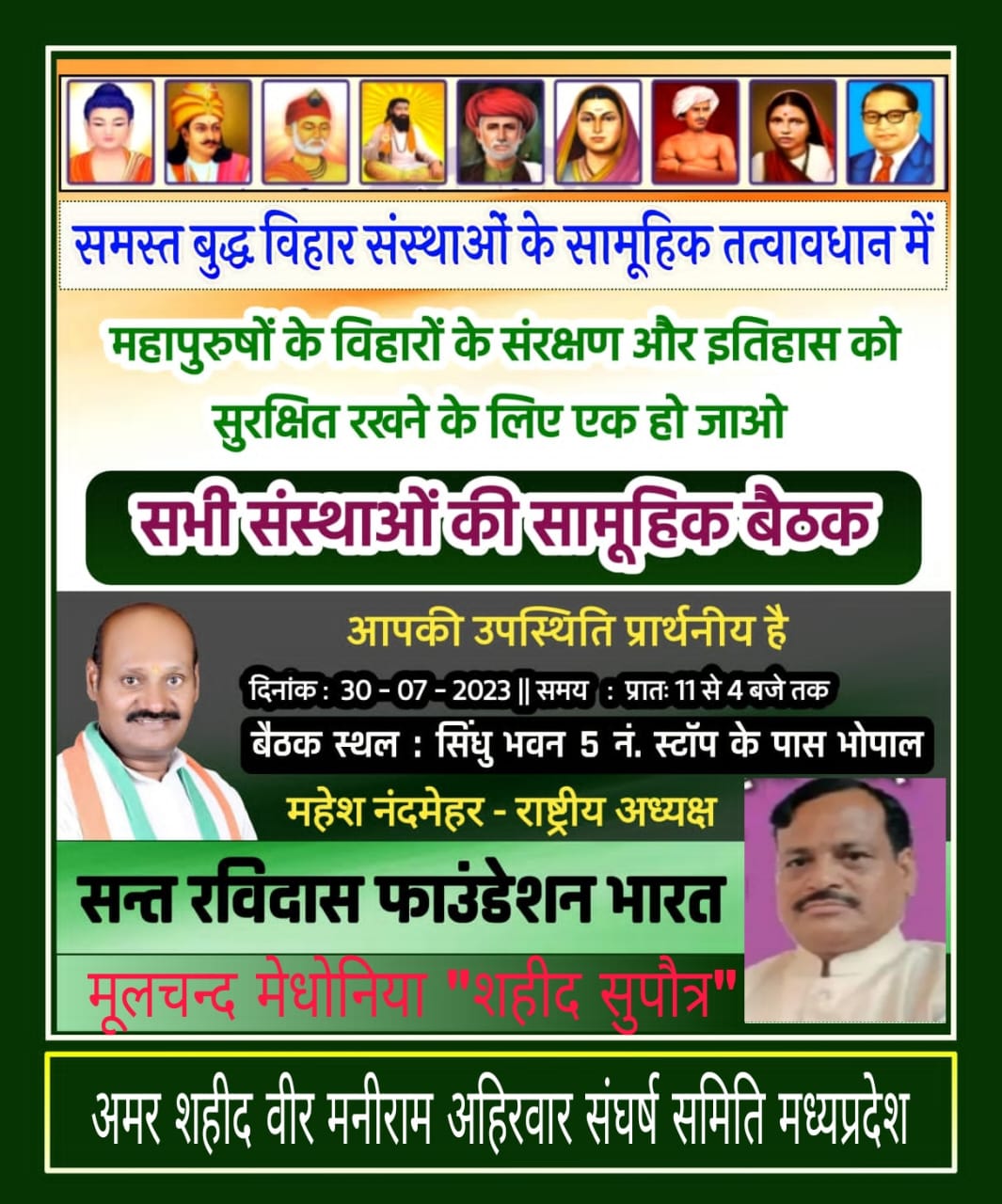 संत रविदास कल्याण फाउंडेशन भारत के राष्ट्रीय अध्यक्ष श्री महेश नंदमेहर एवं भीम ज्योति बौद्ध विहार समिति की अध्यक्ष श्रद्धेय इंदु ताई ने प्रेस विज्ञप्ति जारी कर बताया है कि सौ से अधिक बौद्ध विहारों, सतगुरु रविदास महाराज जी के अनुयायियों की महाबैठक को लेकर उसकी रुपरेखा, तैयारी व ज्ञापन पत्र की तैयारी सहित प्रदेश के इतिहास में हो रही महाबैठक का एजेंडा तय करने हेतु दिनांक 25 जुलाई को शाम 5 बजे आवश्यक बैठक होगी। जिसमें सभी सम्मानित बौद्ध विहारों व सतगुरु रविदास मंदिर समिति के अध्यक्षों को आमंत्रित किया गया है। तथा अनुरोध किया है कि अधिक से अधिक संख्या में समाज के प्रतिनिधि शामिल होकर 30 जुलाई को होने वाली महाबैठक की रुपरेखा व ऐजेंडा तय हेतु बैठक में सम्मिलित हो।