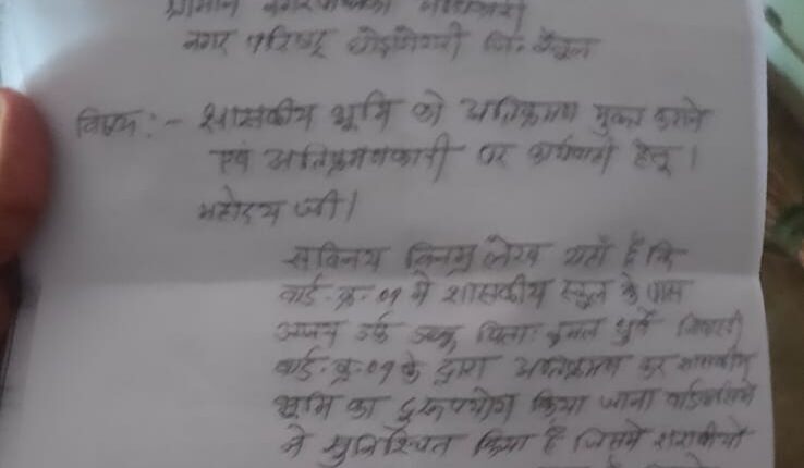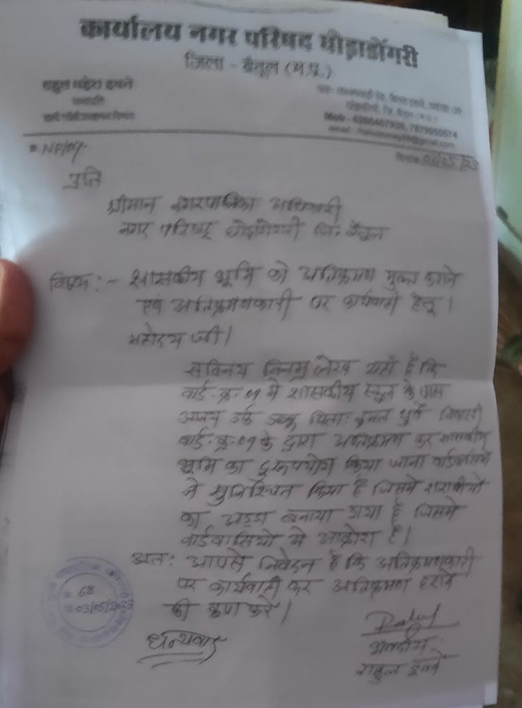 नगर परिषद घोड़ाडोंगरी के वार्ड क्रमांक 9 के पार्षद ने तहसीलदार को पत्र लिखकर वार्ड क्रमांक 9 में शासकीय भूमि पर हुए अतिक्रमण को हटाने की मांग की है जिसके लिए उन्होंने बताया कि उन्हें कई बार नगर परिषद मैं भी आवेदन दिया है