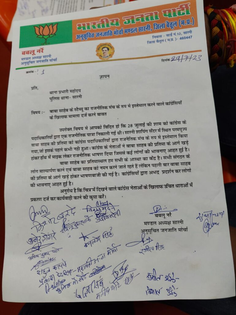 सारनी। कांग्रेस के पदाधिकारियों द्वारा सारनी में बाबा साहब के स्टेच्यू पर चढ़कर भाषणबाजी किये जाने का मामला तूल पकड़ने लगा है। भाजपा अनुसूचित जाति एवं अनुसूचित जन जाति मोर्चा के कार्यकर्ताओं ने इस घटना पर कड़ा एतराज जताते हुए थाना प्रभारी को ज्ञापन सौंप कर कांग्रेसियों के खिलाफ कारवाई की मांग की है।