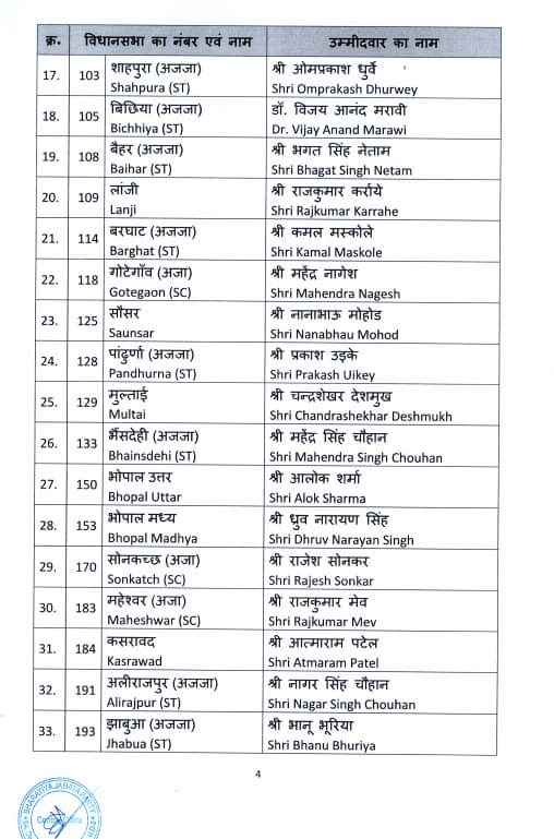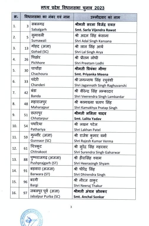 भारतीय जनता पार्टी केन्द्रीय चुनाव समिति ने मध्य प्रदेश में होने वाले आगामी विधानसभा चुनाव 2023 के लिए निम्नलिखित नामों पर अपनी स्वीकृति प्रदान की है।