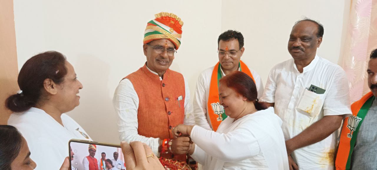 सारनी – विश्वविख्यात आध्यात्मिक नैतिक शिक्षण संस्थान ब्रह्माकुमारीज के सारणी सेवाकेंद्र पर आज मध्यप्रदेश के माननीय मुख्यमंत्री श्री शिवराज सिंह चौहान का आगमन हुआ। मुख्यमंत्री के सेवाकेंद्र आगमन पर ब्रह्माकुमारी बहनों ने तिलक और गुलदस्ता देकर स्वागत किया गया। मुख्यमंत्री महोदय ने सेवाकेंद्र के अंदर पधारकर ब्रह्माकुमारी बहनों से ईश्वरीय ज्ञान चर्चा की। ब्रह्माकुमारीज बैतूल की प्रमुख ब्रह्माकुमारी मंजू बहन जी ने उन्हे तिलक लगाकर साफा पहनाया साथ ही राखी बांधकर उन्हे ईश्वरीय सौगात भेंट की वही सारनी सेवाकेंद्र