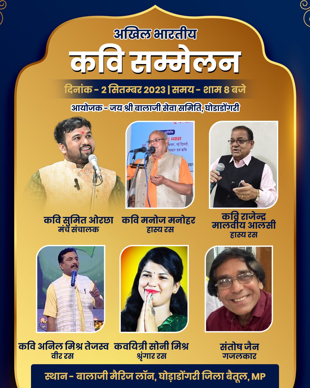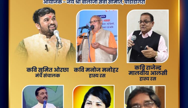 कवि सम्मेलन 2 सितम्बर को By Aajkakhulasha On Aug 31, 2023 🔊 Listen This News अखिल भारतीय कवि सम्मेलन का आयोजन 2 सितंबर को घोड़ाडोंगरी नगर में किया गया है । नगर के बालाजी लॉन में रात 8:00 बजे से यह यह कवि सम्मेलन आयोजित होगा। जिसमें प्रदेश के ख्याति प्राप्त कवि अपनी रचनाओं से श्रोताओं का मनोरंजन करेंगे । शिवराज ने लगाई कमलनाथ के वादों की “वाट” : बहनों को फ्री में प्लॉट, 450 में गैस सिलेंडर, 1250 महीना, बिजली बिल 100 रुपये कवि सम्मेलन
