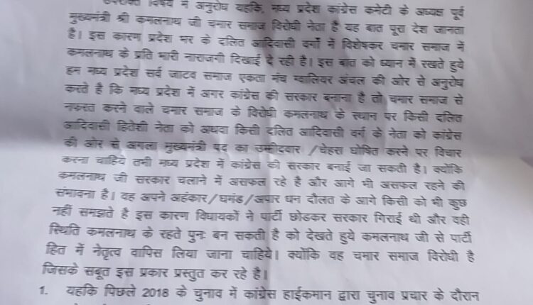 मुरैना। मध्यप्रदेश सर्व जाटव एकता मंच मुरैना के अध्यक्ष भगरी लाल जाटव ने कांग्रेस कमेटी अखिल भारतीय दिल्ली को पत्र लिखकर मांग की है कि मध्यप्रदेश में कांग्रेस की सरकार बनाना है तो चमार समाज विरोधी कमलनाथ के स्थान पर किसी दलित आदिवासी हितेशी नेता को या किसी दलित