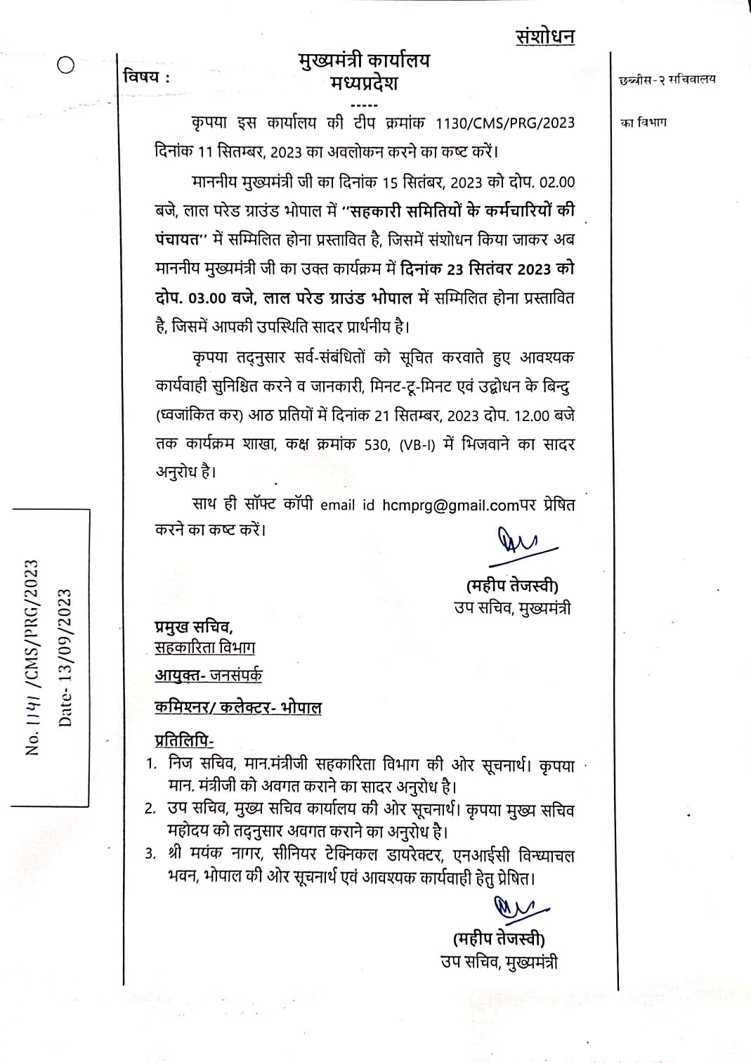 माननीय मुख्यमंत्री जी का दिनांक 15 सितंबर, 2023 को दोप. 02.00 बजे, लाल परेड ग्राउंड भोपाल में “सहकारी समितियों के कर्मचारियों की पंचायत” में सम्मिलित होना प्रस्तावित है, जिसमें संशोधन किया जाकर अब माननीय