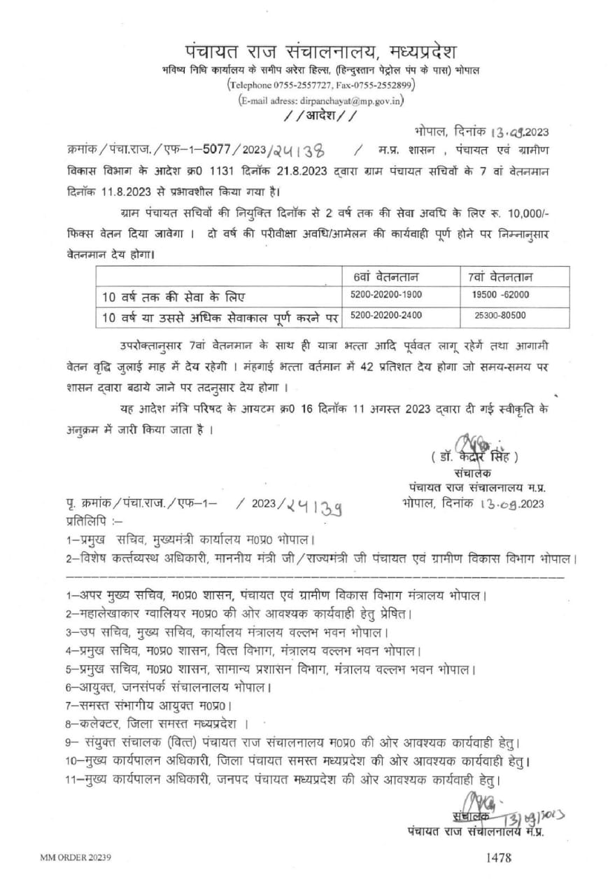 विकास विभाग के आदेश क्र० 1131 दिनांक 21.8.2023 द्वारा ग्राम पंचायत सचिवों के 7 वां वेतनमान दिनांक 11.8.2023 से प्रभावशील किया गया है।