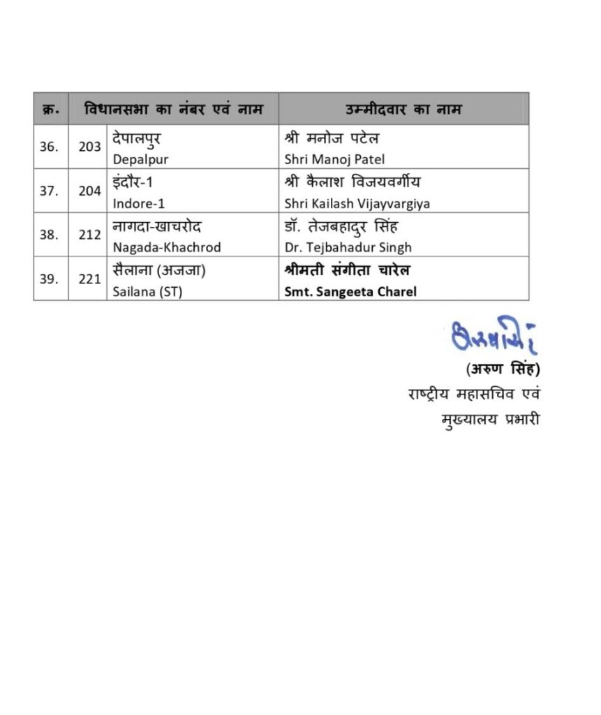 भारतीय जनता पार्टी ने मध्य प्रदेश में विधानसभा चुनाव को लेकर 39 प्रत्याशियों की दूसरी सूची जारी कर दी है जिसमें