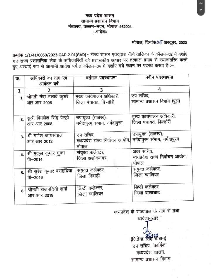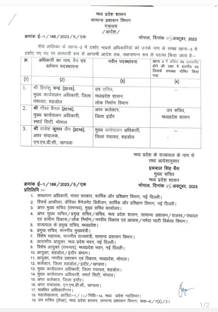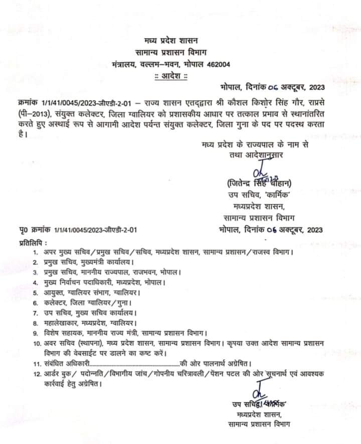 मध्य प्रदेश शासन सामान्य प्रशासन विभाग और गृह विभाग में हुए तबादलों की सूची सामने आई है कई अधिकारियों के ट्रांसफर किए गए हैं जानने के लिए देखें सूची
