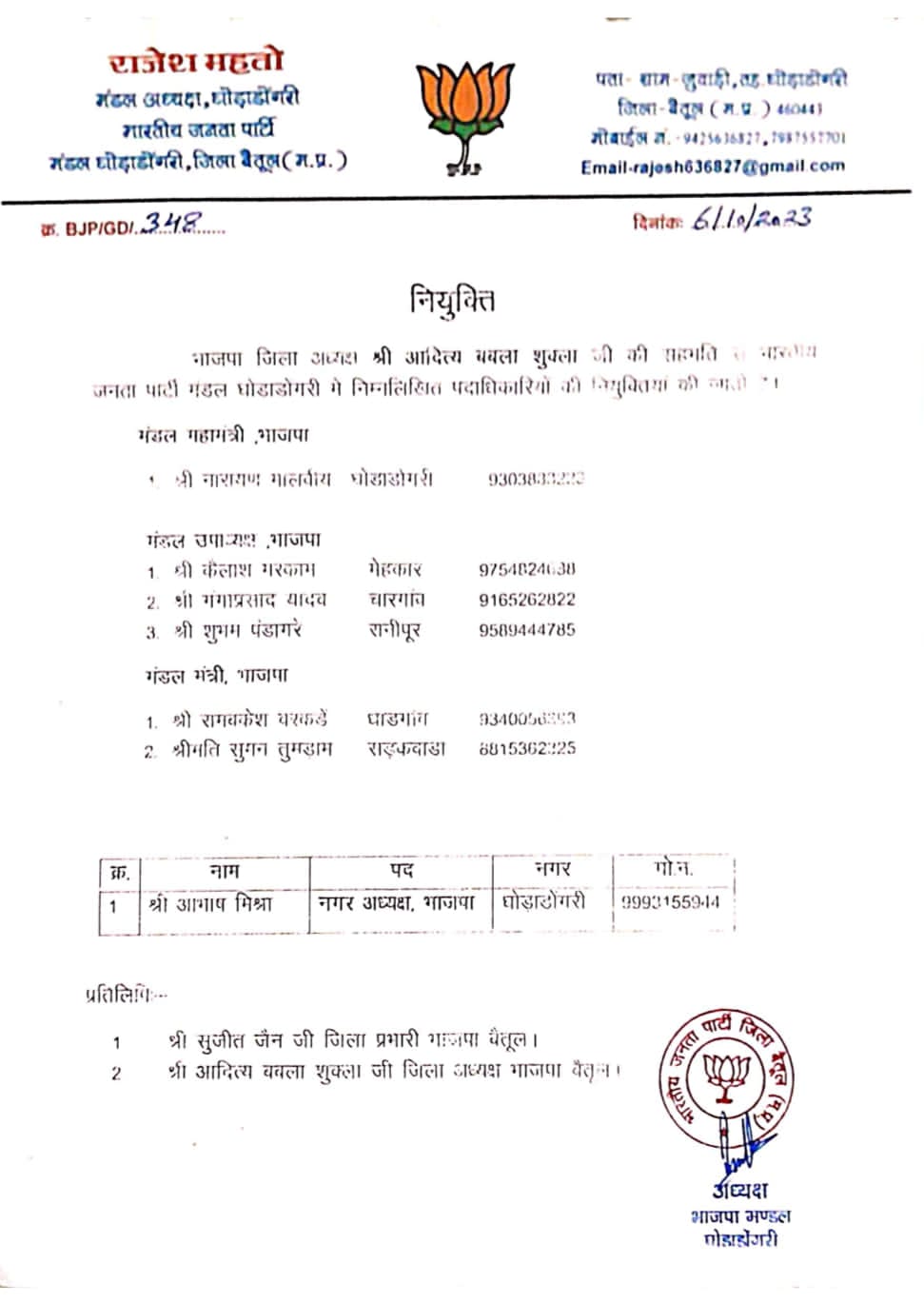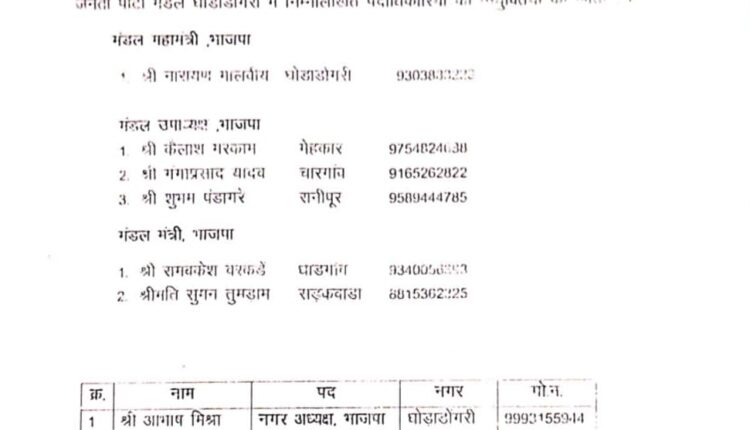 भारतीय जनता पार्टी घोड़ाडोंगरी मंडल अध्यक्ष राजेश महतो ने भाजपा जिला प्रभारी सुजीत जैन एवं भाजपा जिला अध्यक्ष आदित्य शुक्ला की सहमति से आगामी विधानसभा चुनाव को देखते हुए अपनी कार्यकारिणी में रिक्त पदों की नियुक्ति करते हुए भाजपा के महामंत्री पद पर वरिष्ठ नेता नारायण मालवीय को नियुक्त किया साथ ही नगर परिषद के 15 वार्डों में अध्यक्ष भाजपा के रूप में आभाष मिश्रा को नगर अध्यक्ष का दायित्व
