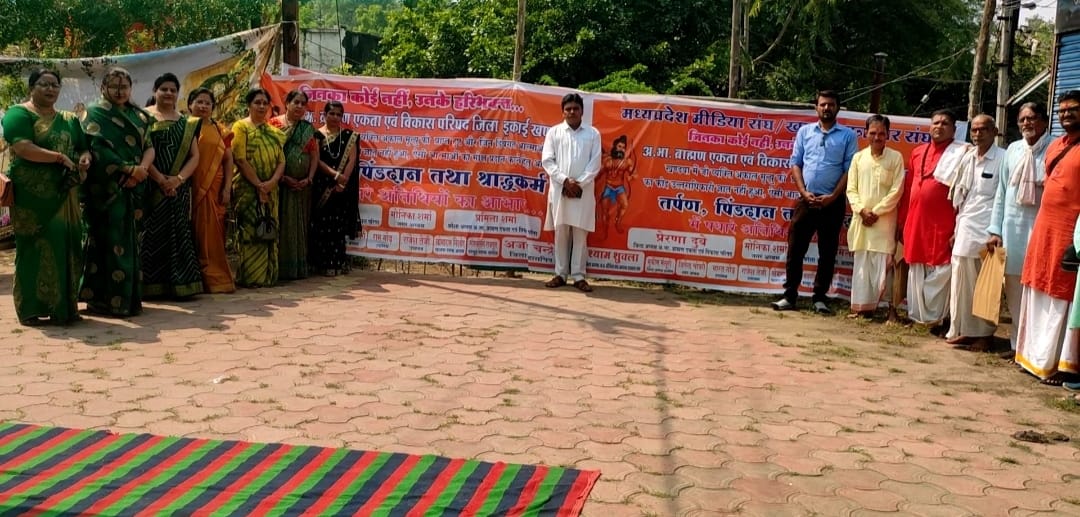 ( खंडवा ) श्राद्ध पक्ष के अवसर पर खंडवा में मध्य प्रदेश मीडिया संघ व खंडवा पत्रकार संघ के जिला अध्यक्ष श्री श्याम शुक्ला व पत्रकार साथियों द्वारा एक अनुकरणीय पहल की गई । आपको बता दे की देश प्रदेश से खंडवा में आए हुए। वह लोग जो कि किसी कारणवश अकाल मृत्यु को प्राप्त हुए। जिनका की लावारिस शवों के अंतर्गत अंतिम क्रियाकर्म समाजसेवियों द्वारा निःस्वार्थ भाव से किया गया । अखिल भारतीय ब्राह्मण एकता विकास परिषद प्रदेश अध्यक्ष श्रीमती प्रमिला शर्मा ने कहा कि दिवंगतों की आत्मा कि शांति के लिए विधिवत 11 ब्राह्मणों द्वारा श्राद्ध तर्पण एवं पिंडदान किया गया । अखिल भारतीय ब्राह्मण एकता विकास परिषद जिलाअध्यक्ष श्रीमती प्रेरणा दुबे एवं शहर अध्यक्ष श्रीमती मोनिका शर्मा मैं कहां नर सेवा ही नारायण सेवा है। एवं उनके साथियों द्वारा श्राध्द