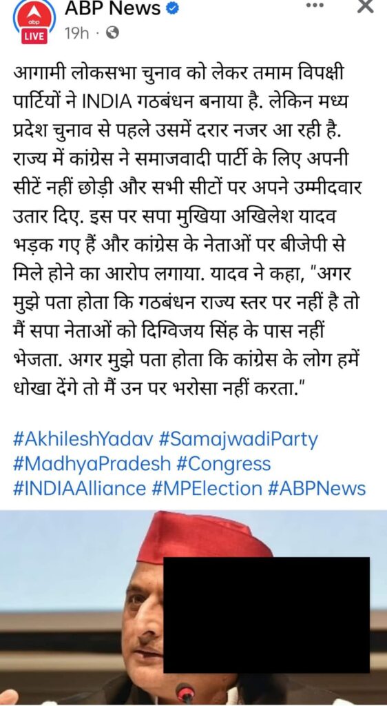 आगामी लोकसभा चुनाव को लेकर तमाम विपक्षी पार्टियों ने INDIA गठबंधन बनाया है. लेकिन मध्य प्रदेश चुनाव से पहले उसमें दरार नजर आ रही है. राज्य में कांग्रेस ने समाजवादी पार्टी के लिए अपनी सीटें नहीं छोड़ी और सभी सीटों पर अपने उम्मीदवार उतार दिए. इस पर सपा मुखिया अखिलेश यादव भड़क गए हैं और कांग्रेस के नेताओं पर बीजेपी से मिले होने का आरोप लगाया.