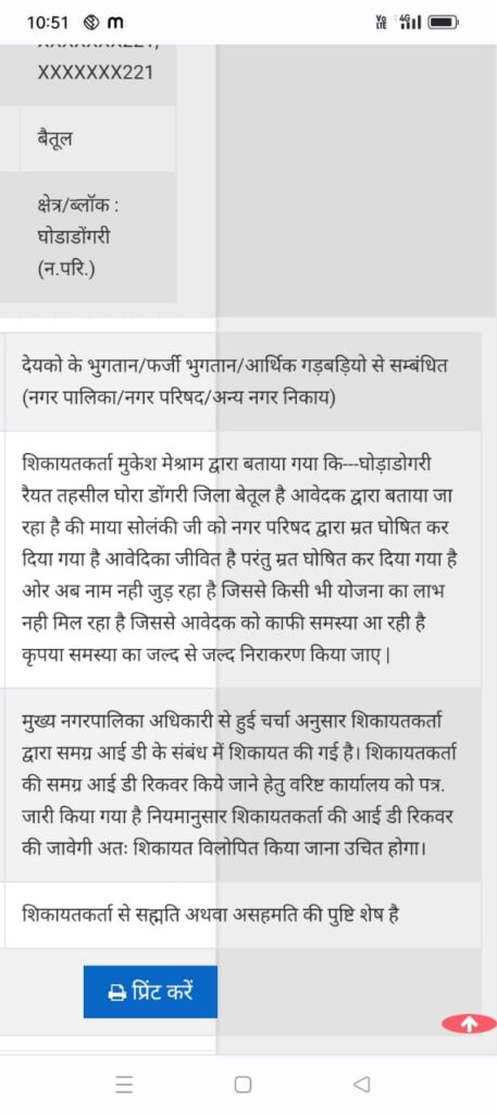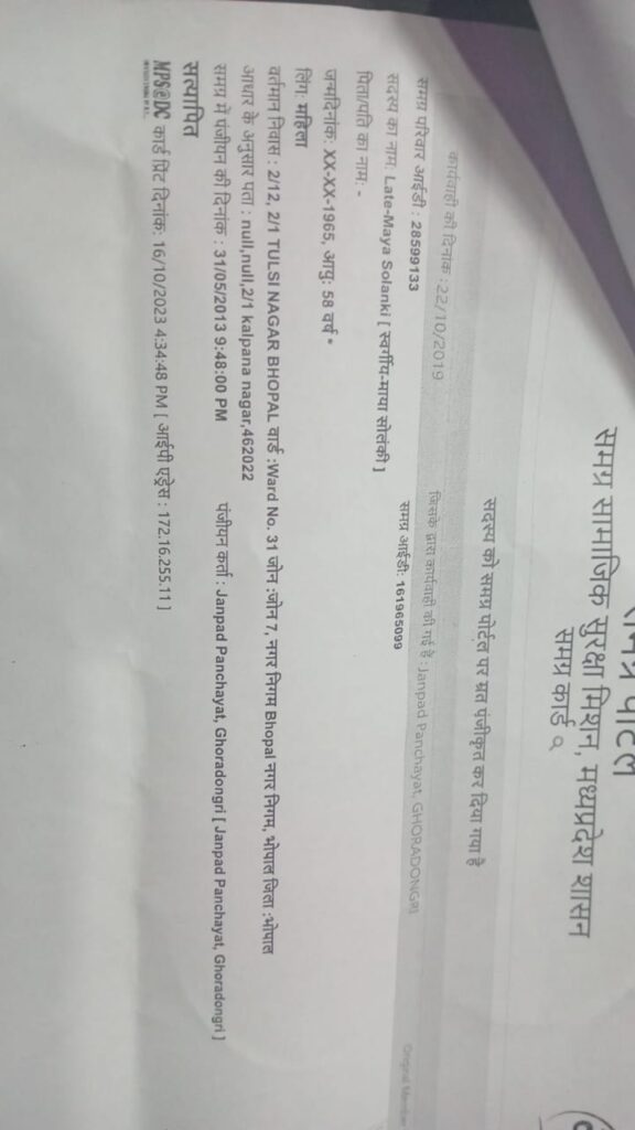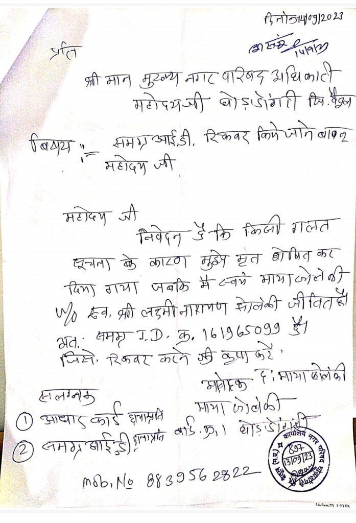 जिसकी जानकारी उनके संज्ञान में आने के बाद मुकेश मेश्राम ने मामले की शिकायत सीएम हेल्पलाइन पर की और नगर परिषद कार्यालय में भी इस मामले के बारे में अवगत कराते हुए कार्यवाही प्रारंभ कराई। मुकेश मेश्राम की सजगता के कारण माया सोलंकी की डिलीट हुई समग्र आईडी रिकवर हो गई और उनके नाम के आगे लगा स्वर्गीय माया सोलंकी भी हट गया।