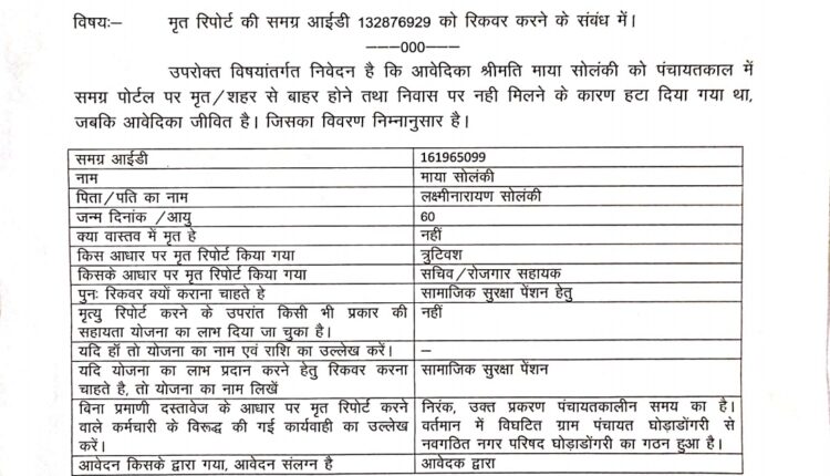 सरकारी कागजों में मृत घोषित हुई एक महिला को वार्ड पार्षद के प्रयासों से जीवित हो गई । मामला घोड़ाडोंगरी के वार्ड क्रमांक 1 का है यहां के वार्ड पार्षद मुकेश मेश्राम की सजगता के कारण वर्षों से कागजों में मृत महिला आखिरकार जीवित घोषित हो गई। पार्षद मुकेश मेश्राम ने बताया कि उनके वार्ड क्रमांक 1 की महिला माया सोलंकी स्वर्गीय लक्ष्मी नारायण सोलंकी की समग्र आईडी रिकॉर्ड से डिलीट होने के साथ-साथ रिकॉर्ड में महिला का नाम स्वर्गीय माया सोलंकी लिखा आ रहा था ।