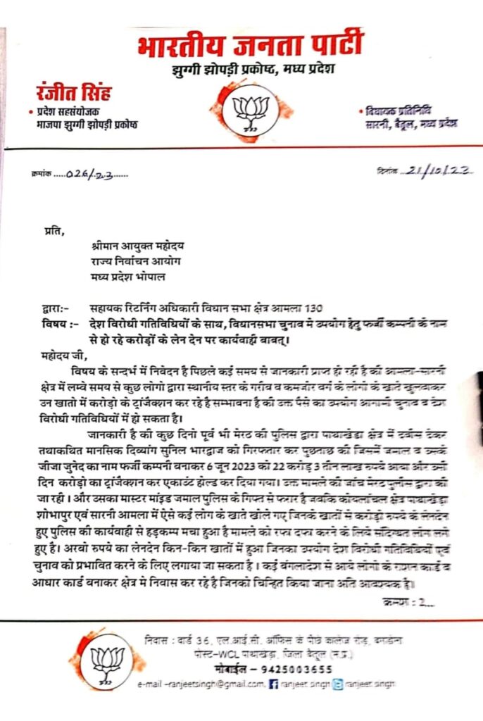 आमला सारनी विधानसभा क्षेत्र में फर्जी कम्पनी के नाम से हो रहे करोड़ों के लेन देन की विस्तृत जांच की मांग की।आयुक्त राज्य निर्वाचन आयोग मध्य प्रदेश को लिखे पत्र में उल्लेख करते हुए कहा की आमला-सारनी क्षेत्र में लम्बे समय से कुछ लोग द्वारा स्थानीय स्तर के गरीब व कमजोर वर्ग के लोगो के खाते खुलवाकर उन खातो में करोड़ो के ट्रांजैक्शन कर रहे है सम्भावना है की उक्त पैसे का उपयोग आगामी चुनाव व देश विरोधी गतिविधियों में हो सकता है भाजपा नेता रंजीत सिंह ने बातया की जानकारी है की कुछ दिनो पूर्व मेरठ की पुलिस द्वारा