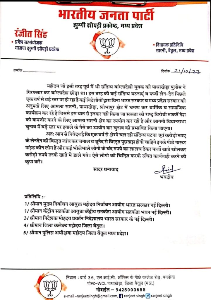 सारनी| भारतीय जनता पार्टी झुग्गी झोपड़ी प्रकोष्ठ के प्रदेश संयोजक रंजीत सिंह ने सहायक रिटर्निंग अधिकारी विधानसभा क्षेत्र आमला को आयुक्त राज्य निर्वाचन आयोग मध्य प्रदेश के नाम पत्र लिखकर