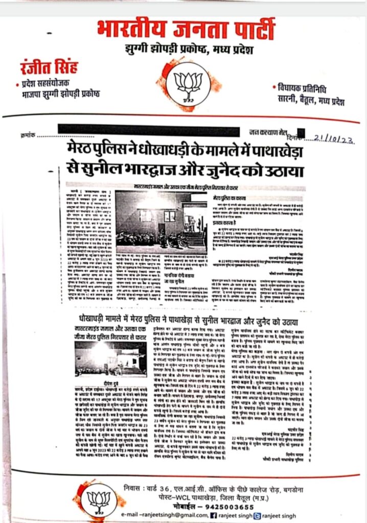 पाथाखेडा क्षेत्र में दबीस देकर तथाकथित मानसिक दिव्यांग सुनिल भारद्वाज को गिरफतार कर पुछताक्ष की जिसमें जमाल व उसके जीजा जुनेद का नाम फर्जी कम्पनी बनाकर 6 जून 2023 को 22 करोड़ 3 तीन लाख रुपये आया और उसी दिन करोड़ो का ट्रांजैक्शन कर एकाउंट होल्ड कर दिया गया। उक्त मामले की जांच मेरठ पुलीस द्वारा की जा रही। और उसका मास्टर मांइड जमाल पुलिस के गिफ्त से फरार है जबकि कोयलांचल क्षेत्र पाथाखेड़ा शोभापुर एवं सारनी आमला में ऐसे कई लोग के खाते खोले गए जिनके खातों से करोड़ो रुपये के लेनदेन हुए पुलीश की कार्यवाही से हड़कम्प मचा हुआ है मामले को रफा दफा करने के लिये संदिग्धत लोग लगे हुए है।