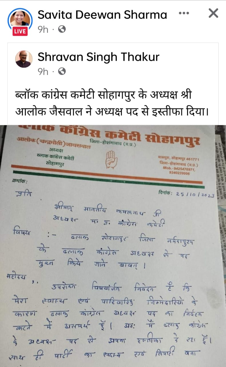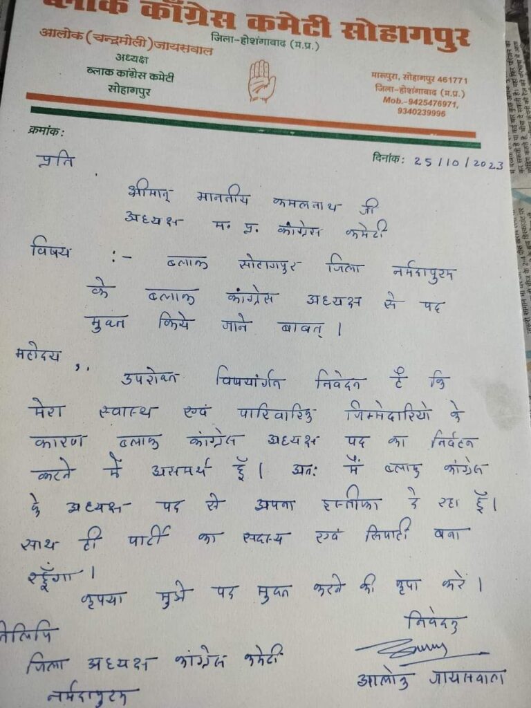 ब्लॉक कांग्रेस कमेटी सोहागपुर के अध्यक्ष श्री आलोक जैसवाल ने अध्यक्ष पद से इस्तीफा दिया।