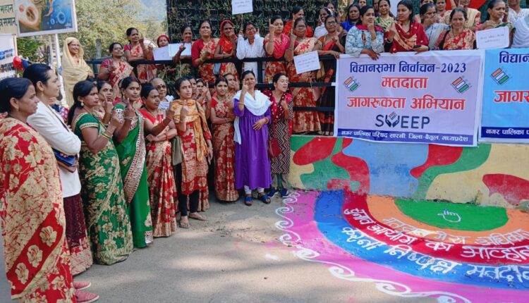 सारनी। भारत निर्वाचन आयोग के निर्देश पर नगर पालिका परिषद सारनी द्वारा विधानसभा चुनाव 2023 में शत-प्रतिशत मतदान के लिए स्वीप प्लान के तहत मतदाता जागरूकता अभियान चलाया जा रहा है। इसी क्रम में शनिवार 28 अक्टूबर 2023 को नगर पालिका परिषद सारनी से जय स्तंभ चौक तक मतदाता जागरूकता रैली का आयोजन किया गया। इसमें नगर पालिका के अधिकारी, कर्मचारियों और आंगनबाड़ी कार्यकर्ता और सहायिकाओं ने हिस्सा लिया।
