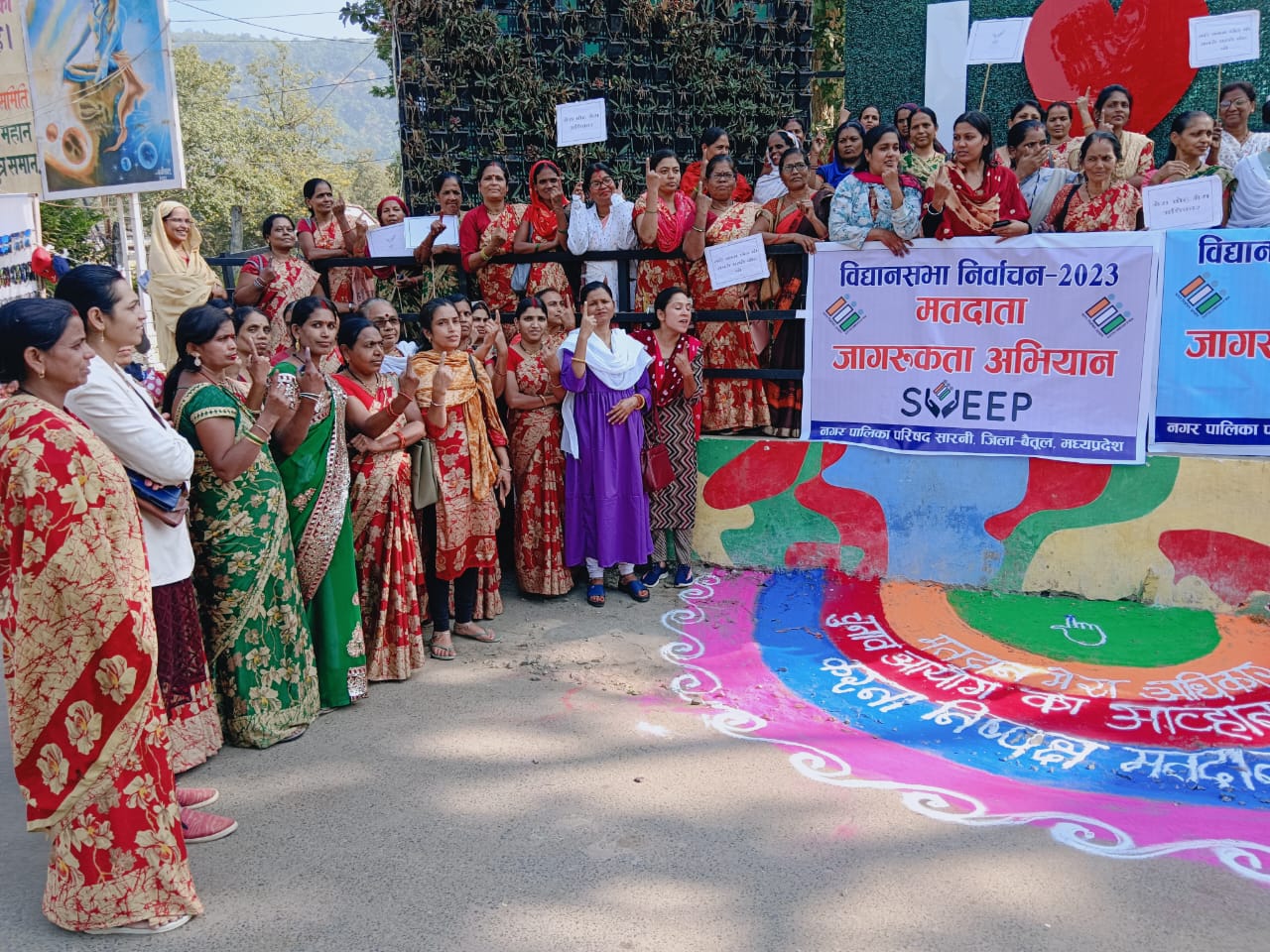 नगर पालिका परिषद सारनी के सभाकक्ष में एवं कार्यालय परिसर में मतदान जागरूकता से संबंधित रंगोली सजाई गई। इसके बाद यहां सभी को शत-प्रतिशत मतदान करने की शपथ दिलाई गई। स्वीप प्लान के नोडल अधिकारी नायब तहसीलदार संतोष पथोरिया, मुख्य नगर पालिका अधिकारी सी. के. मेश्राम, महिला बाल विकास विभाग की परियोजना अधिकारी संगीता धुर्वे, रश्मि अकोदिया एवं नगर पालिका के अन्य अधिकारियों की मौजूदगी में कार्यालय परिसर से रैली का आयोजन किया गया। पेट्रोल पंप, बस स्टैंड, शॉपिंग सेंटर, केंद्रीय विद्यालय होते हुए रैली जय स्तंभ चौक पहुंची। यहां नायब तहसीलदार संतोष पथोरिया ने सभी से मतदान करने का आग्रह किया। उन्होंने कहा कि 17 नवंबर को सुबह 7 से शाम 6 बजे तक मतदान होगा। उन्होंने आम नागरिकों से अधिक से अधिक संख्या में अपने मताधिकार का प्रयोग करने का आग्रह किया। इस मौके पर उपयंत्री रविंद्र वराठे, कमलेश पटेल, नितिन मीना, केएल सोनारे, विनायक बागड़े, महेश शर्मा, तीरथ वरकड़े, सुखदेव बोहरपी, गुरूस्वामी एरोलू, श्रीपत काटोलकर राजेश बगाहे, राजेश वागद्रे,लक्ष्मण पंडाग्रे,स्वीप प्लान प्रभारी रंजीत डोंगरे, निराकार सागर, कामदेव सोनी, दीपक मोहबे, अनिल लिल्लहोर, बुधराम मोहाबे, कीर्ति नायक, संतोष धोटे, अनिता लोखंडे, गुणवंत हुरमाड़े समेत अन्य लोग उपस्थित थे। स्वीप प्लान के तहत नगर पालिका परिषद द्वारा मुख्य नगर पालिका अधिकारी सी. के. मेश्राम के निर्देशन में जागरूकता अभियान चलाया जा रहा है। इसके तहत विभिन्न स्कूलों में रंगोली, मेहंदी, स्लोगन, निबंध, भाषण स्पर्धाओं का आयोजन किया जा रहा है। इसके अलावा युवाओं को जागरूक करने के लिए विभिन्न स्थलों पर सेल्फी प्वाइंट बनाए गए हैं। वहीं सार्वजनिक चौक-चौराहों एवं वार्डों में लोगों को जागरूक करने के लिए लगातार आयोजन कर रही है। नगर पालिका परिषद ने आम लोगों से विधानसभा चुनाव 2023 में अधिक से अधिक संख्या में मतदान करने का आग्रह किया है।