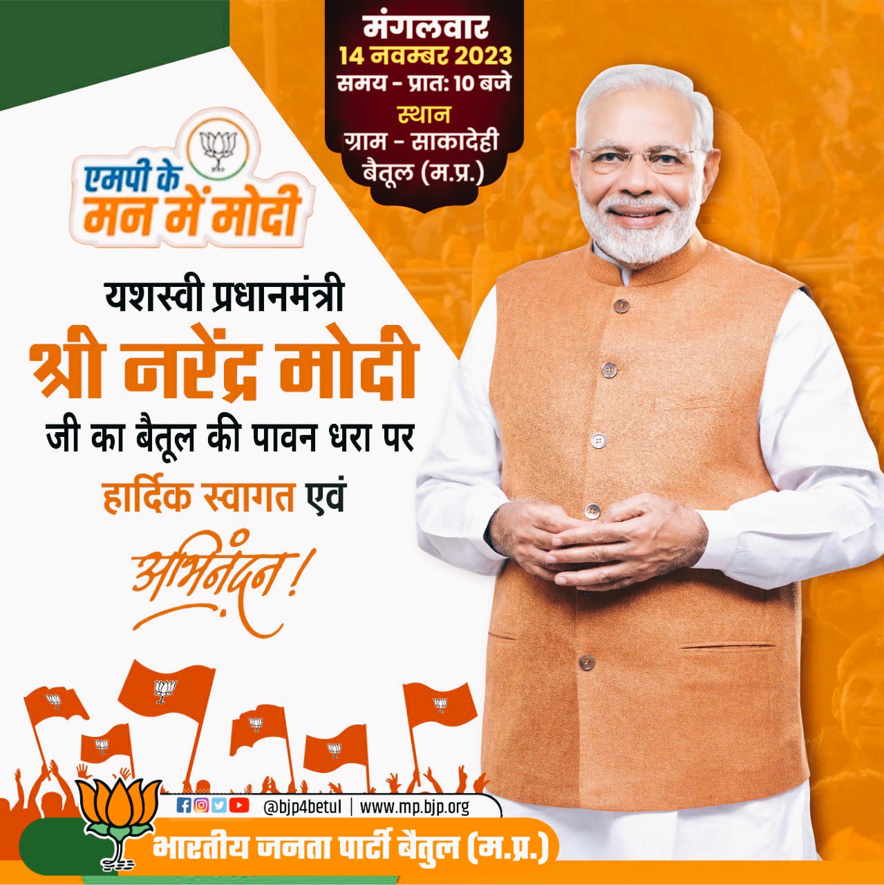 (घोड़ाडोंगरी) प्रधानमंत्री और वैश्विक नेता बनने के बाद पहली बार बैतूल जिले की पावन धरा आ रहे प्रधानमंत्री नरेंद्र मोदी के आगमन को लेकर भारी उत्साह का माहौल नजर आ रहा है खासकर विधानसभा चुनाव के इस माहौल में भाजपा के नेताओ और कार्यकर्ताओं में खासा उत्साह है और आम जनता भी ये मान कर चल रही है कि मोदी की सभा के बाद भाजपा 5-0 से फतहा कर ले तो कोई अतिशयोक्ति नही होंगी प्रधानमंत्री नरेंद्र मोदी के आगमन पर बैतूल जिले का हर व्यक्ति उनसे रूबरू और मिलना चाहता है लेकिन वैश्विक नेता होने के कारण हाई सिक्योरिटी सुरक्षा प्राप्त मोदी के आसपास परिंदा भी पर नही मार सकता पिछले चार दिनों से साकादेही के आसपास के क्षेत्र को एसपीजी ने अपने हांथो में ले लिया है