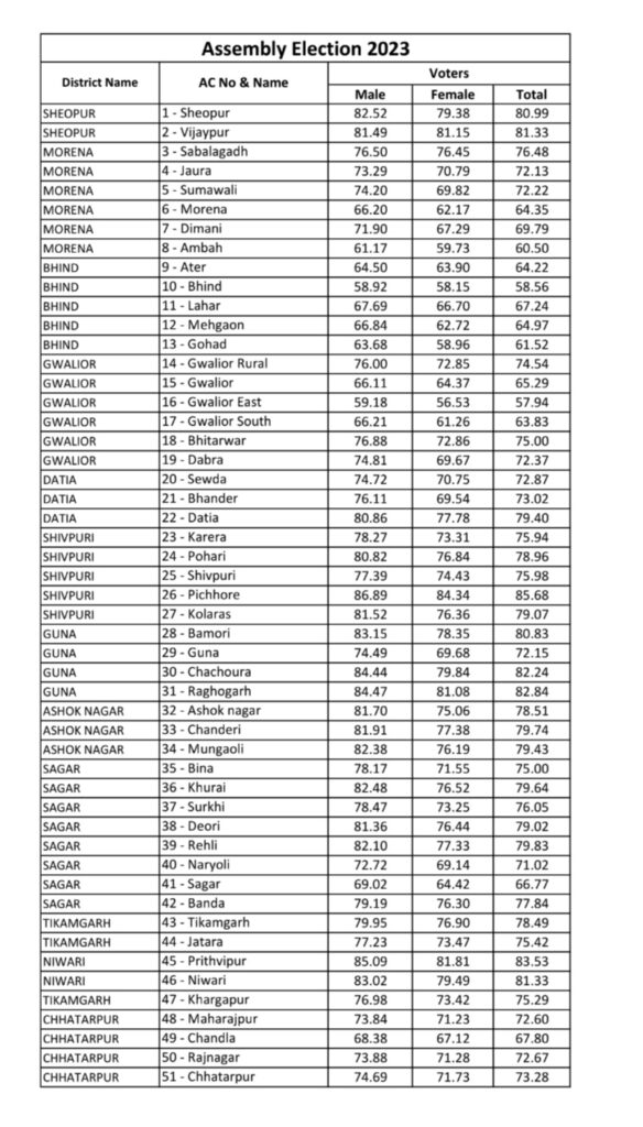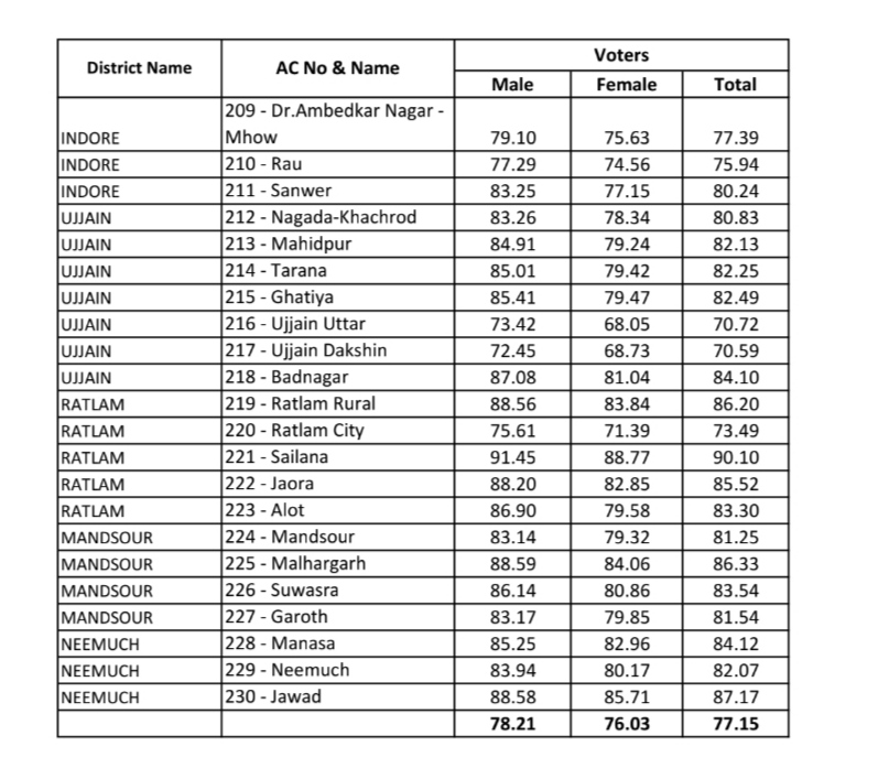 प्रदेश की 230 विधानसभा सीटों पर कुल 77.15% मतदान हुआ है जिसमें पुरुषों ने 78.21% मतदान किया वहीं महिलाओं ने 76.03% मतदान किया है। मतदान के मामलों में पुरुषों ने महिलाओं को पीछे छोड़ दिया है और दो प्रतिशत अधिक पुरुषों ने मतदान में भाग लिया है।