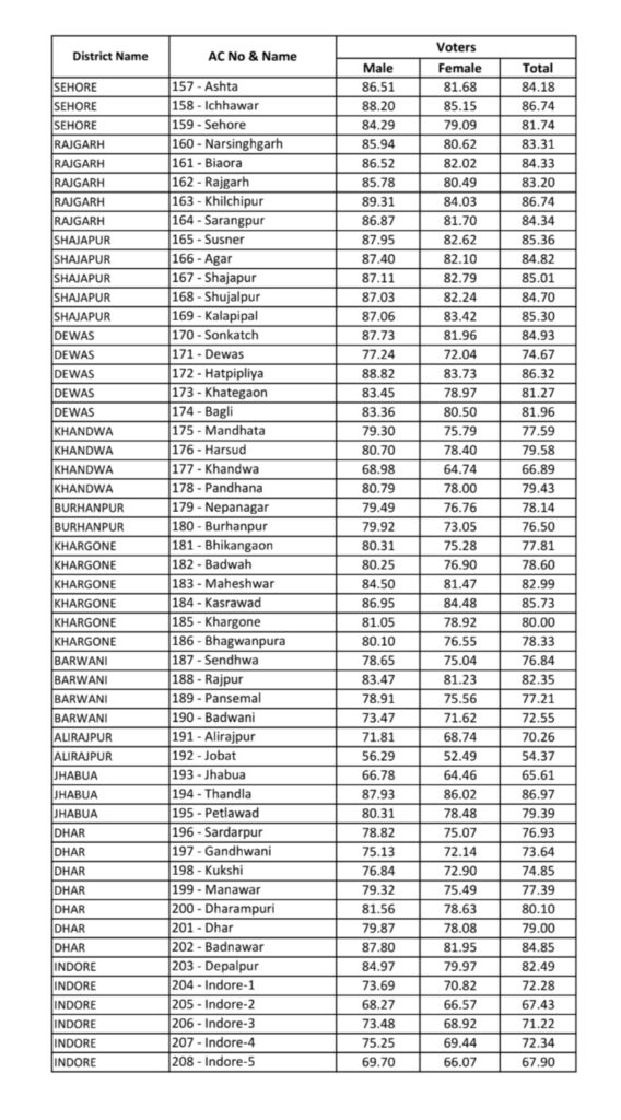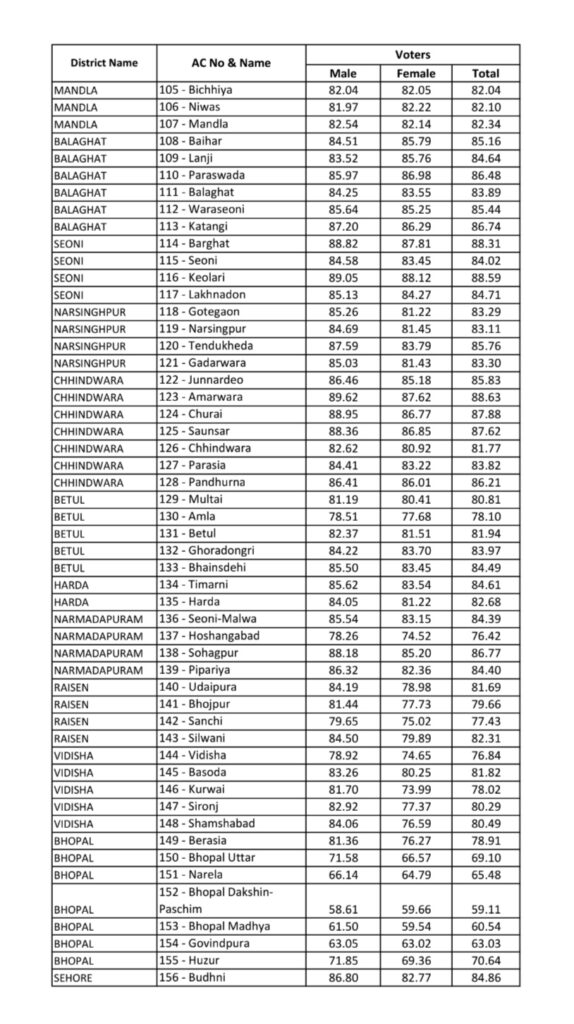 प्रदेश में सबसे अधिक मतदान रतलाम जिले के सैलाना विधानसभा क्षेत्र क्रमांक 221 के मतदाताओं ने किया ।यहां पर 90.10% मतदान हुआ है ।दूसरे नंबर पर सिवनी जिले के कोयलारी विधानसभा क्षेत्र क्रमांक 116 के मतदाताओं द्वारा किया गया यहां पर 88.59 प्रतिशत मतदान हुआ। तीसरे नंबर पर सबसे अधिक मतदान में सिवनी जिले के विधानसभा क्षेत्र क्रमांक 114 बरघाट के मतदाताओं द्वारा किया गया ।यहां के मतदाताओं ने 88.31 प्रतिशत मतदान किया ।