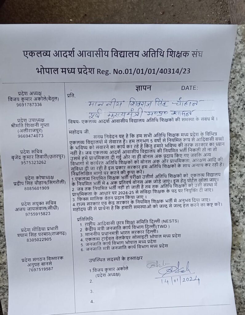 इसी तारतम्य में एकलव्य अतिथि शिक्षक संगठन मध्य प्रदेश संगठन के प्रदेश अध्यक्ष विजय अकोले द्वारा पूर्व मुख्यमंत्री माननीय शिवराज सिंह चौहान को एकलव्य विद्यालय में कार्यरत अतिथि शिक्षकों की समस्याओं के संबंध में ज्ञापन सोपा गया जिसमें पूर्व मुख्यमंत्री जी द्वारा जल्द ही इस विषय को सरकार तक पहुंचाने का आश्वासन दिया।