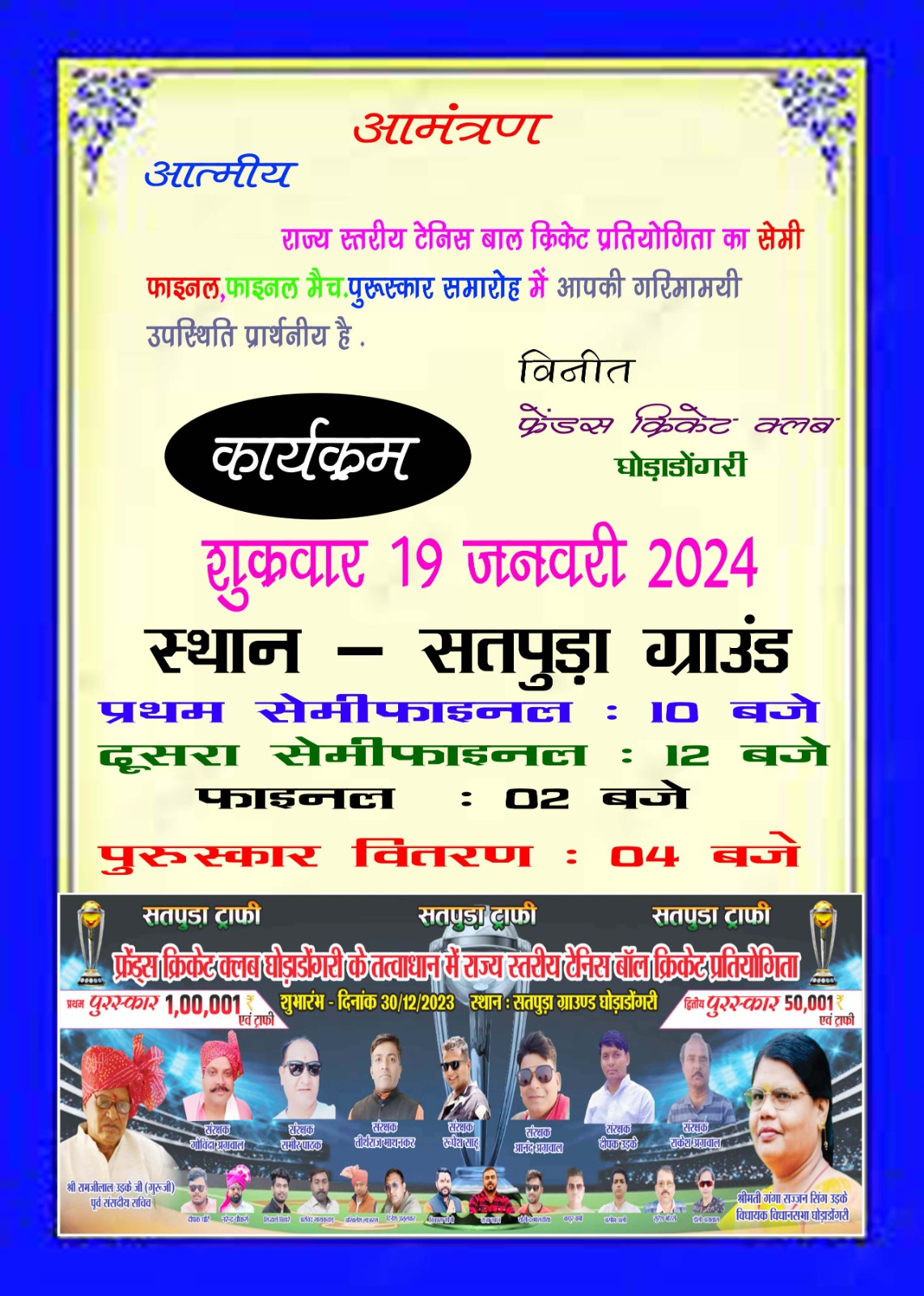 पुरस्कार वितरण समारोह को भव्य बनाने में फ्रेंड्स क्लब की पूरी टीम जुटी हुई है ।समिति के संरक्षक गोविंदा अग्रवाल संरक्षक समीर पाठक संरक्षक आनंद अग्रवाल संरक्षक रूपेश साहू संरक्षक तीर्थराज माथनकर अख़लेश लजरस संरक्षक राकेश अग्रवाल रामदास उबनारे नरेंद्र चौकसे दीपक धोटे आशीष वागदरे विकास सोनी राजा खान रोहित चौहान सिद्धार्थ बिहारे शशांक सोनी बडू ठाकुर अमर ज्योति शिवेंद्र यस वसीम खान दिनेश अतुलकर कपूर वर्मा सुरेश भोरसे पीरु भलावी अमरज्योति आशु चोकिकर रोहित अग्रवाल आकाश वर्मा हर्ष चौकसे नयन खेतवाश उपस्थित थे।