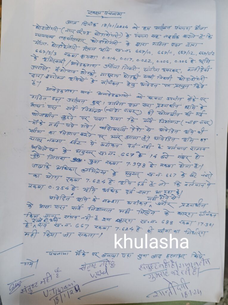 आज दिनांक 18/01/2024 को हम उपस्चित पंचगण मौजा घोड़ाडोंगरी (नगर परिसर घोड़ाडोंगरी) के पंचगण यह तस्दीक करते है कि न्यायालय तहसीलदार घोड़ाडोंगरी के द्वारा गठित दल मौजा- घोड़ाडोंगरी भूमि ख.न. 667/10, 667/11, 667/12, 667/5/2 667/5/3 रकबा क्रमशः 0.014, 0.017, 0.022, 0.0०७, ०.००७ हे. भूमि के भूगिस्वामी /आवेदकगण उर्मिला तिवारी संगीता , उपराले, घोड़की, सभी निवासी घोड़ाडोंगरी उपरोक्त भूमियों के सीमांकन हेतु आवेदन पत्र प्रस्तुत किये है। आवेदकगण एवं अनावेदकगणों के सूचना उपर्यंत मौके पर गठित दल उपलित हुए। दल द्वारा भूमि के आस पास सर्वे निशांनकी खोजबीन की गई खोजबीन करने पर पाया गया कि सबै निशांन मौके नहीं पाये गये। बंदोबस्ती मेंड़ो से आवेदित भूमि की सीमा का मिलान करने पर अंतर आता है। आवेदित भूमि का चालू नक्शा सीट में बटांकन दर्ज नहीं है वर्तमान राजस्व अभिलेख के अनुसार स.न. 667 के 14 बरे नंबर हो चुके जिसका रकबा 7.978 है. रकबा होता है। जबकि अधिकार अभिलेय के अनुसार ख.न. 667 के योग रकबा 7.624 है. भूमि दर्ज है जो कि वर्तमान पे