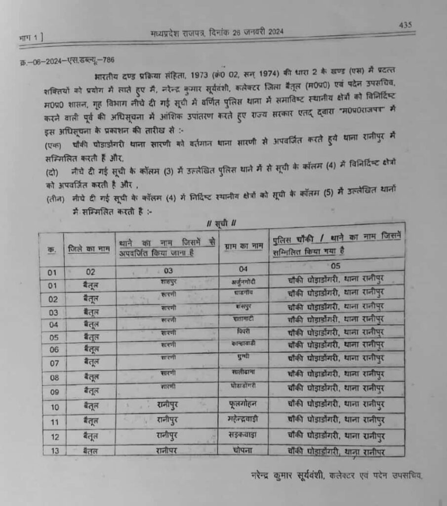 सारणी थाना क्षेत्र के गांव धाड़गांव ,बासपुर ,रातामाटी, पिपरी, कान्हावाडी , सालीढाना , घुग्गी, नगर परिषद क्षेत्र घोड़ाडोंगरी जो घोड़ाडोंगरी पुलिस चौकी से जुड़ा है और थाना सारणी लगता है अब इन सभी गांव का थाना भी रानीपुर हो जाएगा।