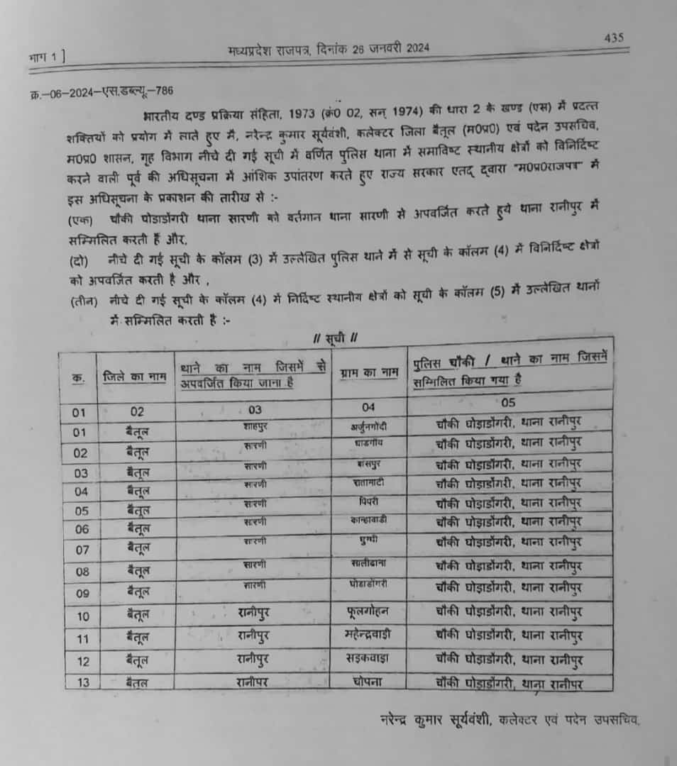 सारणी थाना क्षेत्र के गांव धाड़गांव ,बासपुर ,रातामाटी, पिपरी, कान्हावाडी , सालीढाना , घुग्गी, नगर परिषद क्षेत्र घोड़ाडोंगरी जो घोड़ाडोंगरी पुलिस चौकी से जुड़ा है और थाना सारणी लगता है अब इन सभी गांव का थाना भी रानीपुर हो जाएगा।