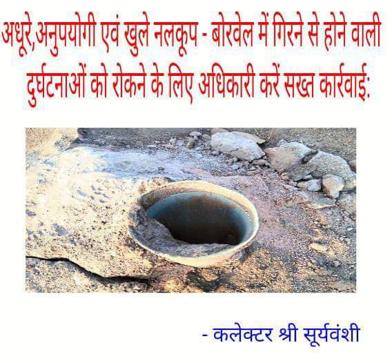 कलेक्टर एवं जिला दंडाधिकारी श्री नरेन्द्र कुमार सूर्यवंशी ने अनुपयोगी एवं खुले नलकूप, बोरवेल तथा ट्यूबवेल में छोटे बच्चों के गिरने से होने वाली दुर्घटनाओं को रोकने के लिए अधिकारियों से कहा कि गंभीरता पूर्वक सख्ती से कदम उठाएं।